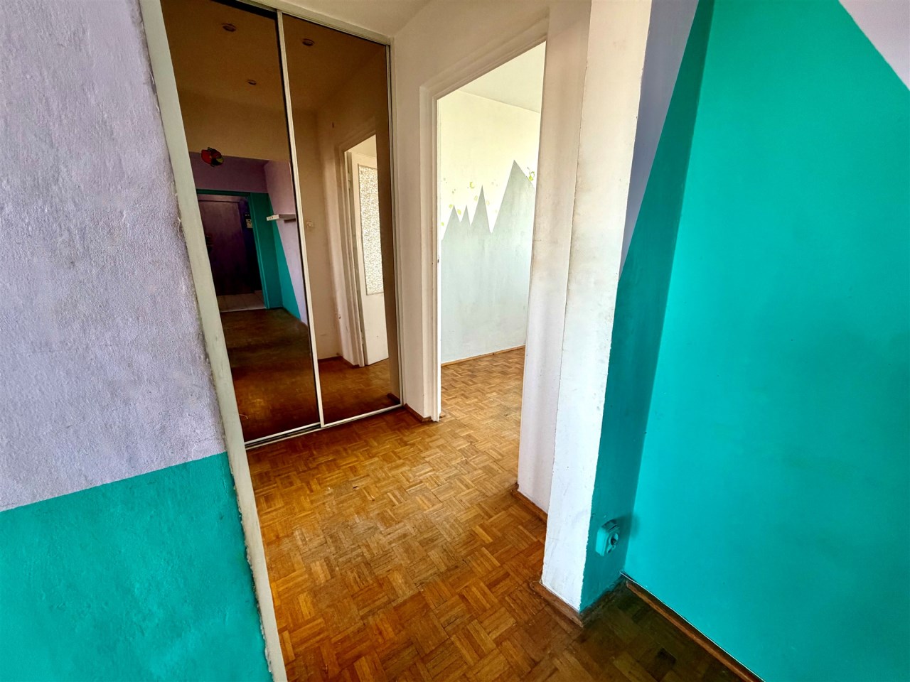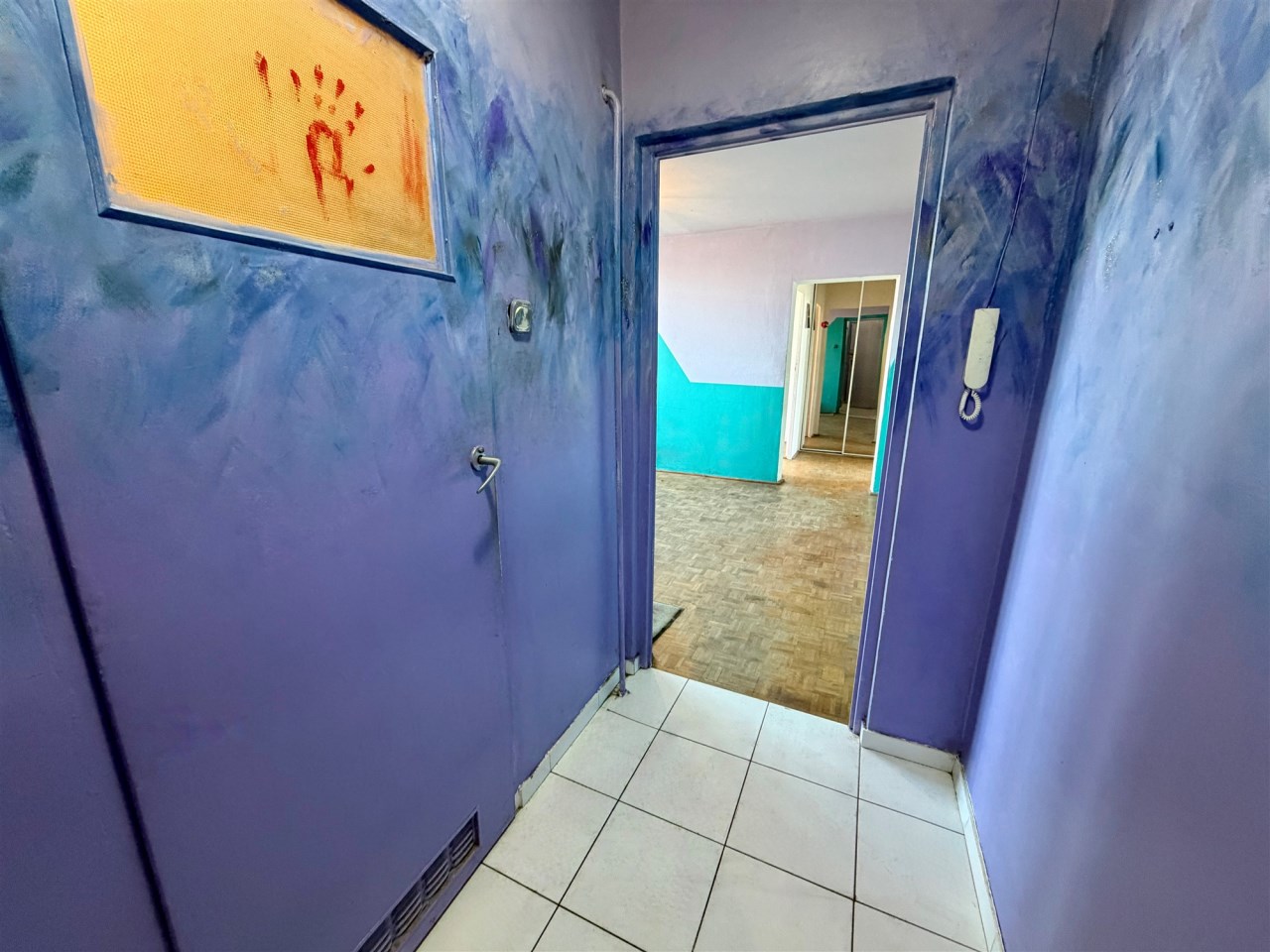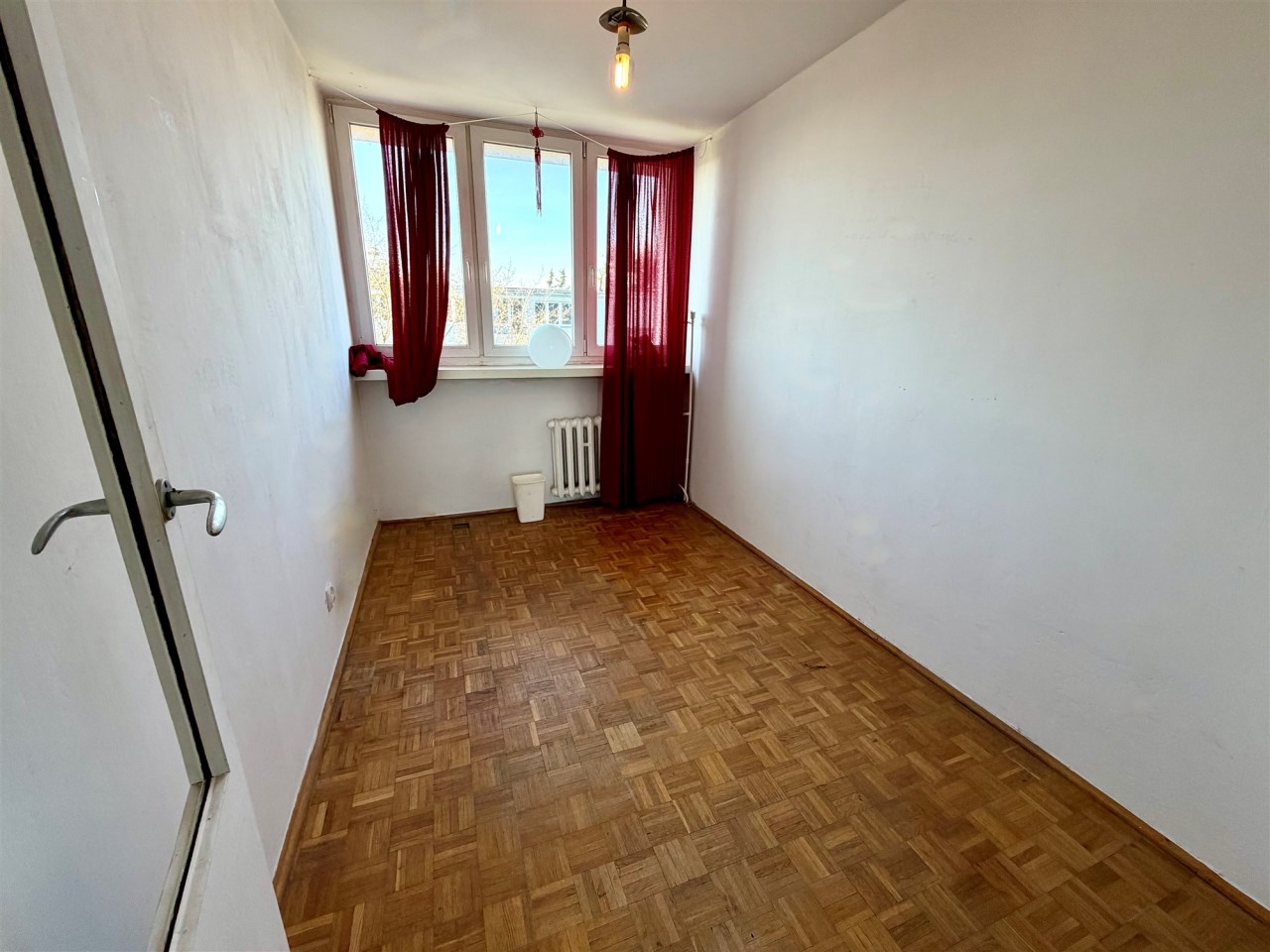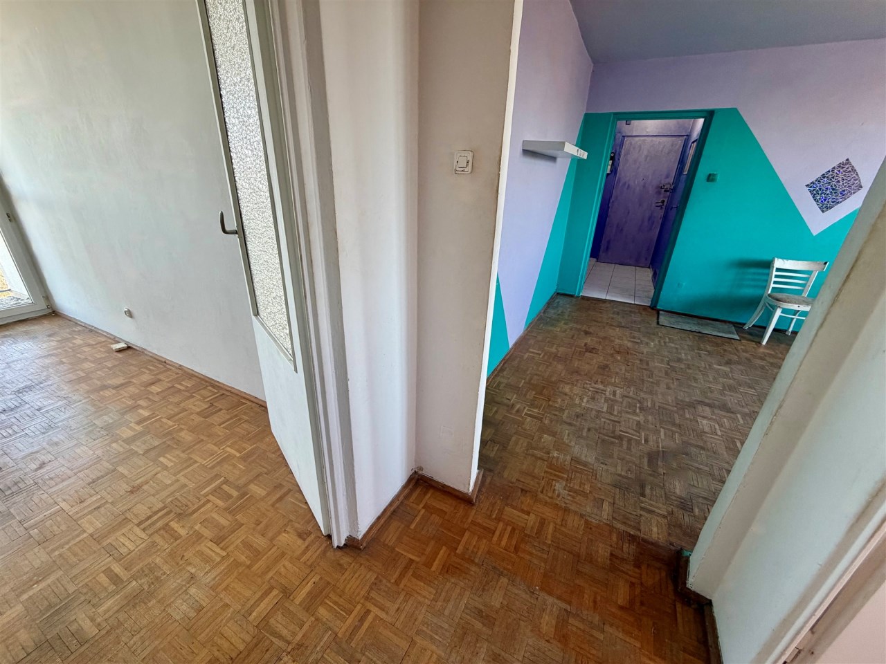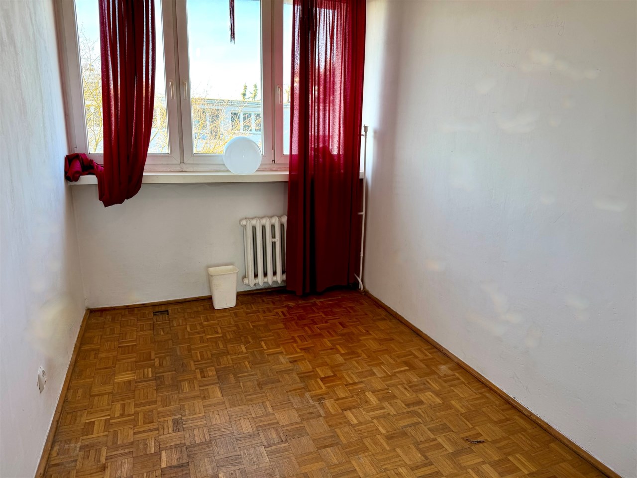 Lokal jest wygodny, ale wymaga remontu. Jest tutaj ustawny pokój dzienny ok. 16 m2 z weściem do dalszego korytarza, z którego są wejścia do dwóch sypialni i w którym jest duża szafa wnękowa. Z jednej z sypialni jest wyjście na loggię (wystawa na wschód). W kuchni tylko kuchnia gazowa i zlewozmywak. W łazience wanna i muszla WC. Lokal nieumeblowany. Na podłogach panele albo kafle.