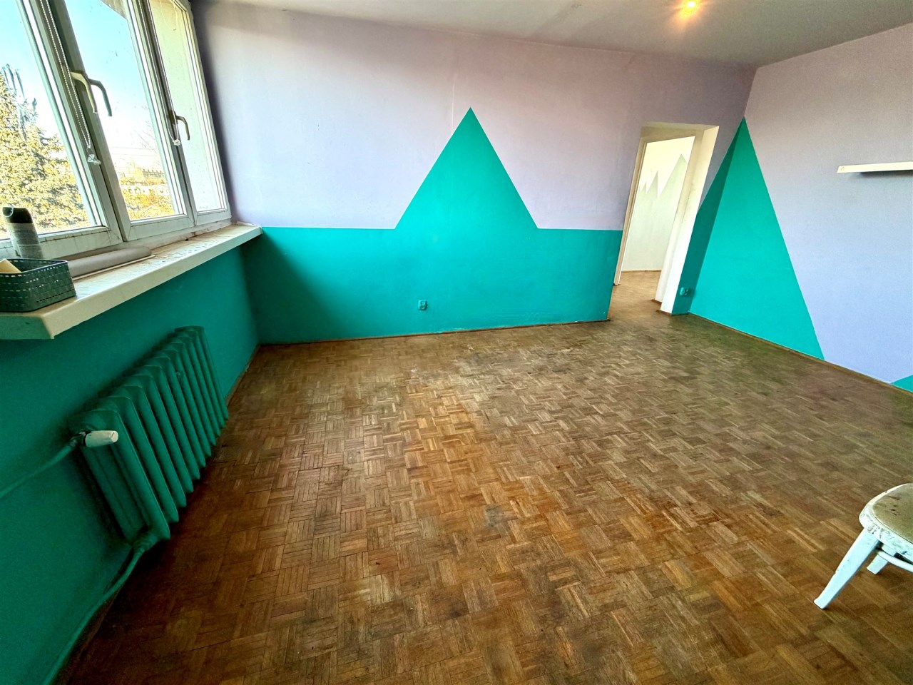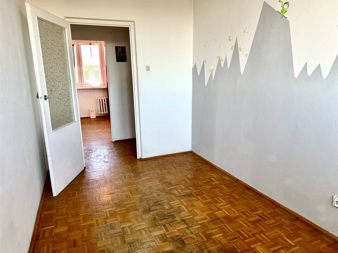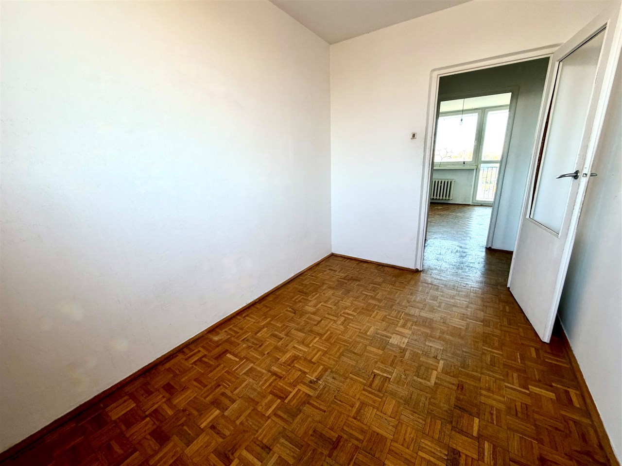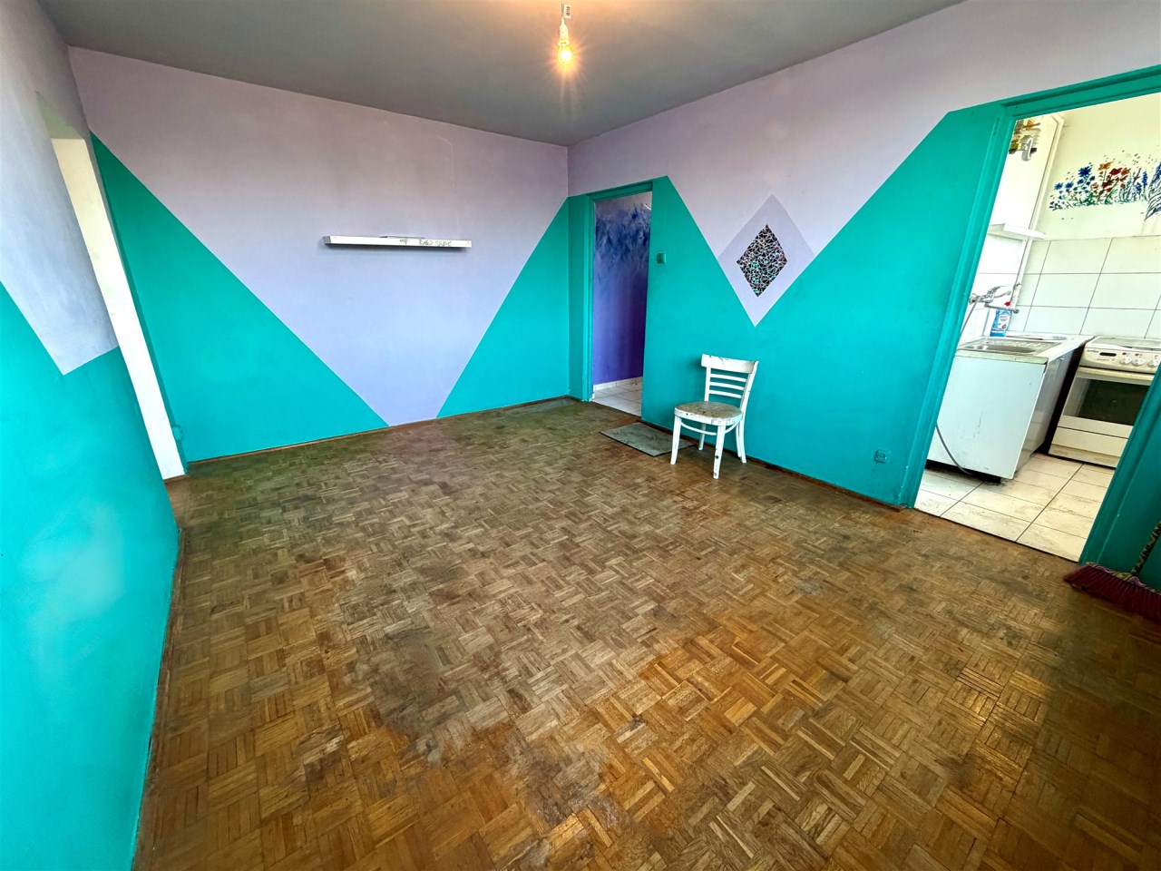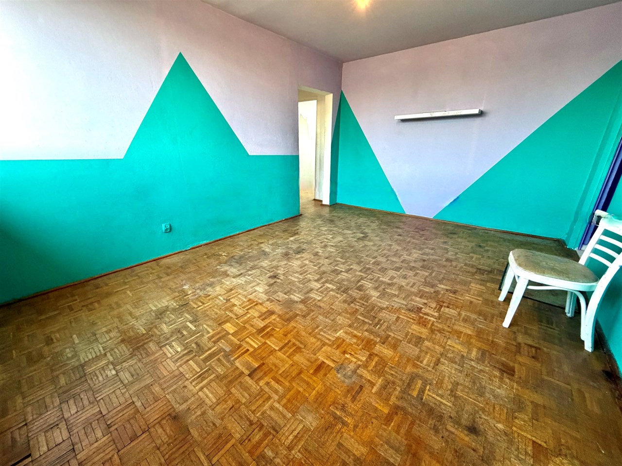 Lokal jest wygodny, ale wymaga remontu. Jest tutaj ustawny pokój dzienny ok. 16 m2 z weściem do dalszego korytarza, z którego są wejścia do dwóch sypialni i w którym jest duża szafa wnękowa. Z jednej z sypialni jest wyjście na loggię (wystawa na wschód). W kuchni tylko kuchnia gazowa i zlewozmywak. W łazience wanna i muszla WC. Lokal nieumeblowany. Na podłogach panele albo kafle.