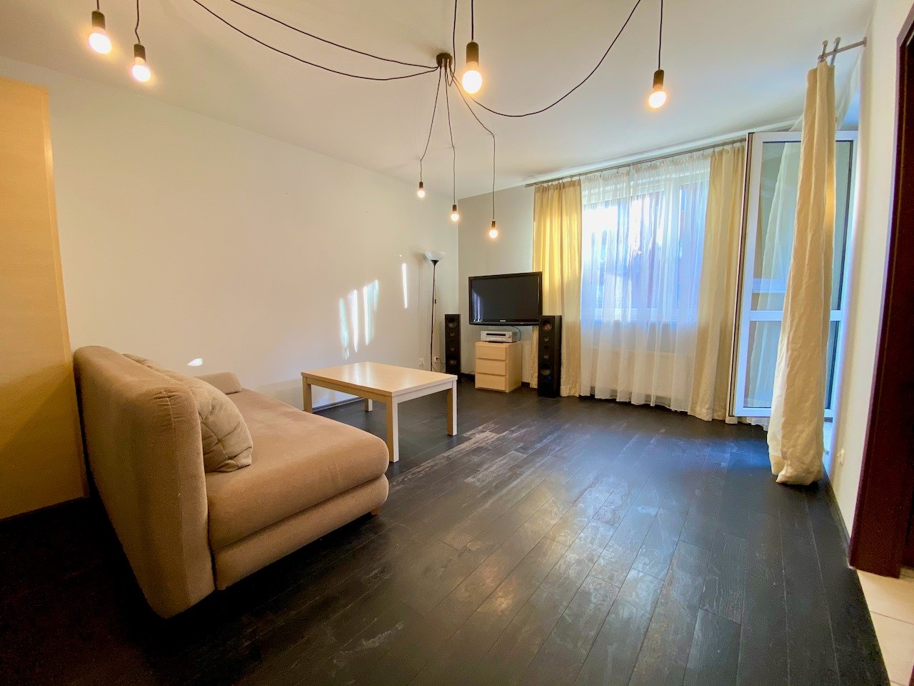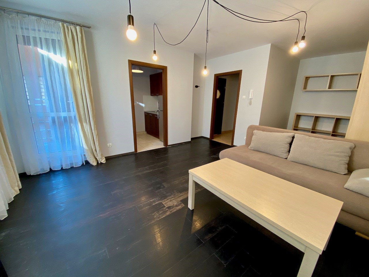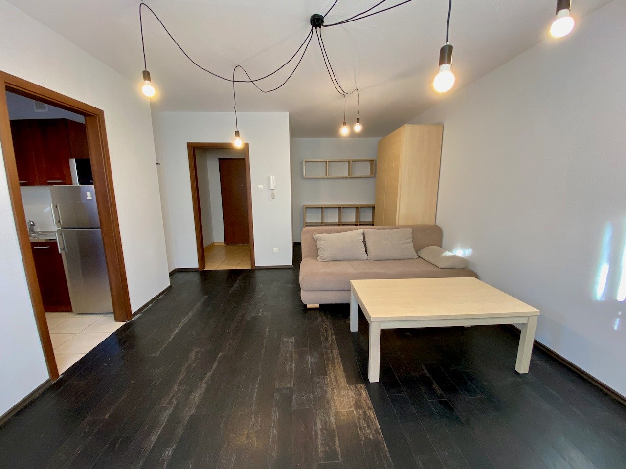 Pokój jest bardzo przestrony - ma około 22 mkw. Na podłodze egzotyczna deska, na ścianach gładzie, wyjście na balkon, okna na wschód. W kuchni meble pod wymiar, lodówka, kuchnia z płytą ceramiczną i piekarnikiem, ściany zabezpieczone szklanymi taflami. Łazienka z kabiną prysznicową, umywalką, szafkami i miejscem na pralkę. Hol z szafą pod wymiar.