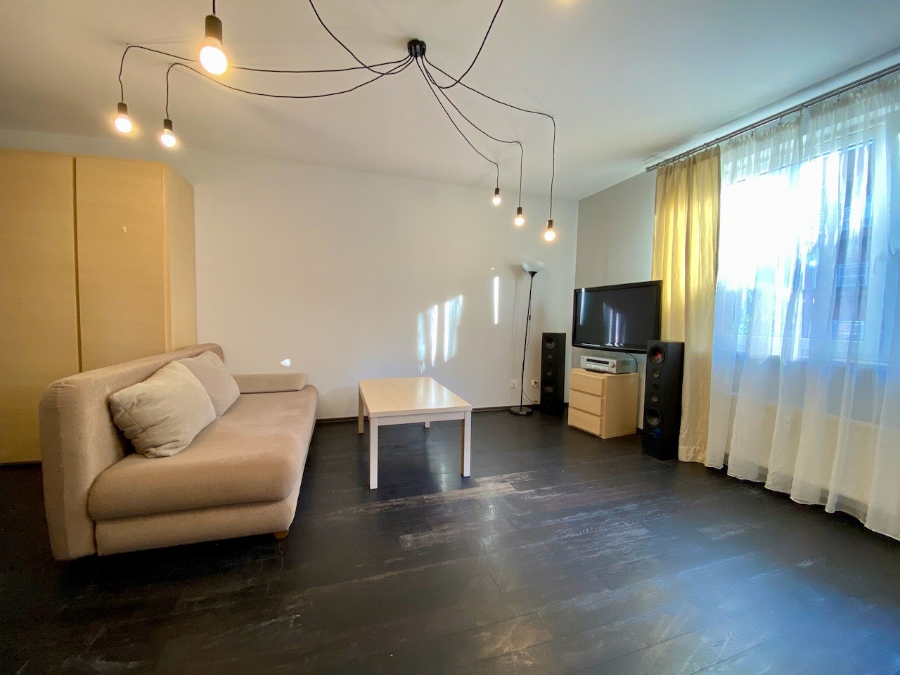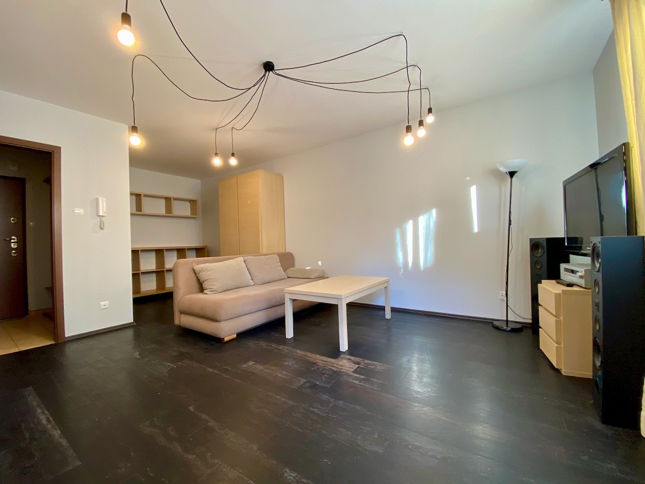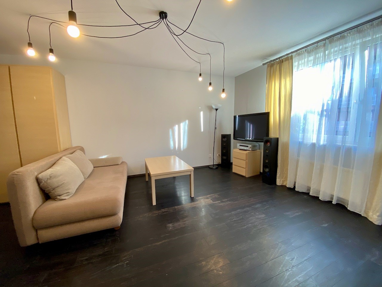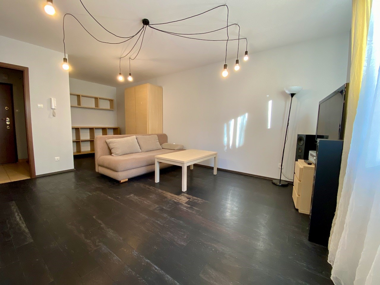 Pokój jest bardzo przestrony - ma około 22 mkw. Na podłodze egzotyczna deska, na ścianach gładzie, wyjście na balkon, okna na wschód. W kuchni meble pod wymiar, lodówka, kuchnia z płytą ceramiczną i piekarnikiem, ściany zabezpieczone szklanymi taflami. Łazienka z kabiną prysznicową, umywalką, szafkami i miejscem na pralkę. Hol z szafą pod wymiar.