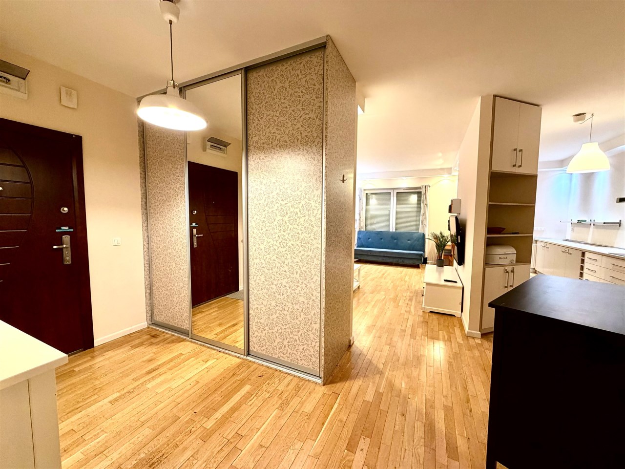 W lokalu jest przestronny salon (19,57 m2) z otwartą kuchnią z aneksem jadalnym (13,10 m2), dwie sypialnie (10,52 m2 i 10,44 m2), łazienka (ok. 5 m2), toaleta (ok. 1 m2) i hol (ok. 12 m2). Podwójne okno w salonie jest jednocześnie wyjściem na taras (16,68 m2) i do ogrodu (85,85 m2) z ekspozycją na zachód - tutaj jest zamontowana markiza z podnośnikiem elektrycznym obsługiwana pilotem, we wszystkich pozostałych oknach zamontowane są zewnętrzne metalowe rolety podnoszone ręcznie. W kuchni meble pod wymiar i sprzęt AGD - zabudowana lodówko-zamrażarka, zabudowana zmywarka, płyta indukcyjna, zabudowany piekarnik, zabudowana mikrofala, wyciąg. Łazienka z wanną i kabiną prysznicową, bidet, umywalka na blacie z szafką, pralko-suszarka i muszla WC. Osobna toaleta z wejściem z holu. Hol z dużą szafą pod wymiar i szafką na buty. Na podłogach parkiet albo kafle. Na ścianach gładzie.