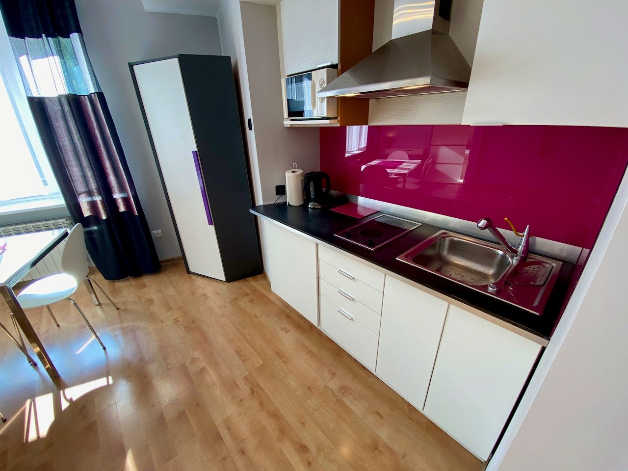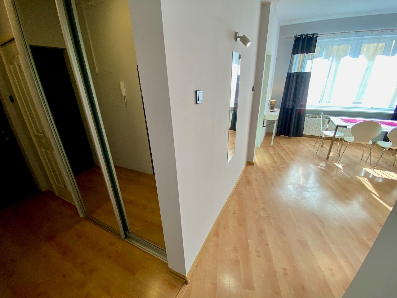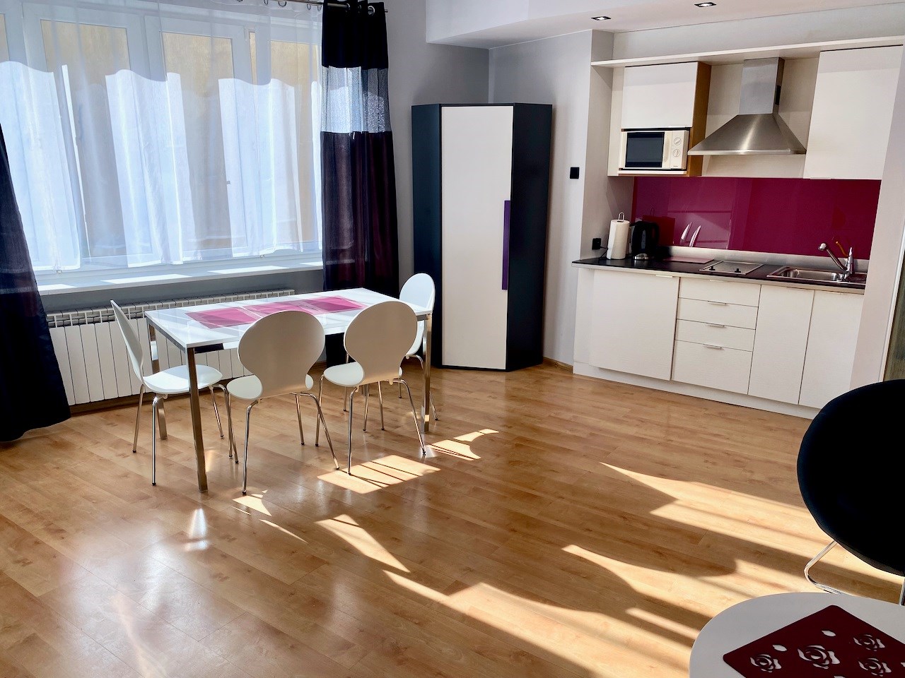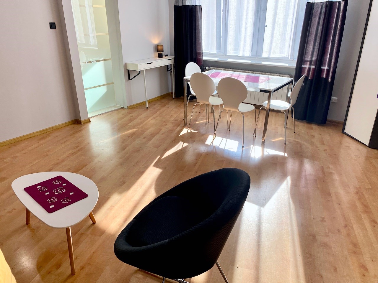 Lokal ze zmianą układu pomieszczeń - przestronny, nowocześnie urządzony pokój z aneksem kuchennym (całość ok. 28 mkw), salon łazienkowy (ok. 12 mkw), osobna toaleta. Okna nie wychodzą na ulicę, więc jest bardzo cicho i kameralnie.