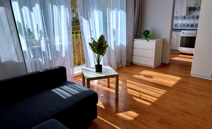 Umeblowanie pokoju - rozkładana kanapa dwu osobowa, stół z krzesłami, fotel do wypoczynku, szafa, szafka RTV, telewizor LCD, szafa wnękowa z pralką i półkami. Kompletne wyposażenie kuchni - meble w zabudowie, płyta ceramiczna 2-palnikowa, zabudowana lodówka, wyciąg, woda ciepła podgrzewana podgrzewaczem przepływowym. Łazienka z oknem z wanną z hydromasażem i osobną kabiną prysznicową i umywalką. Toaleta osobno. Woda ciepła w łazience z bojlera elektrycznego.