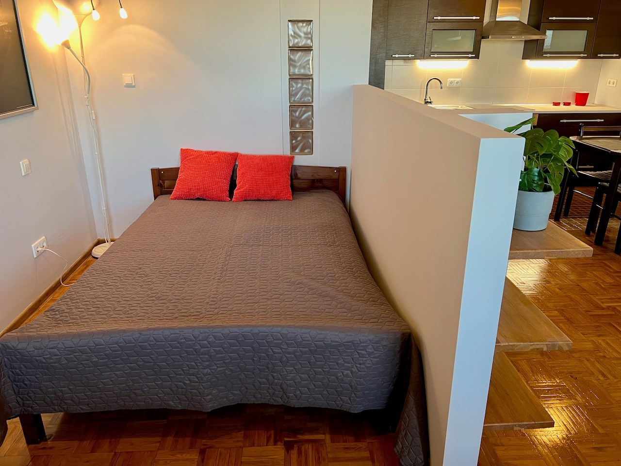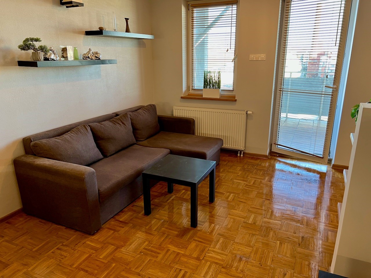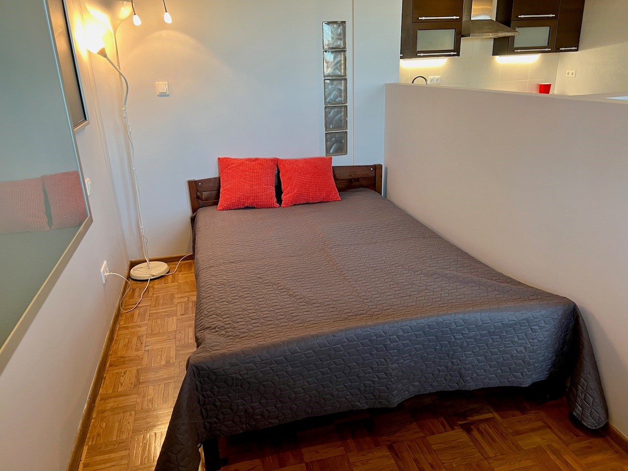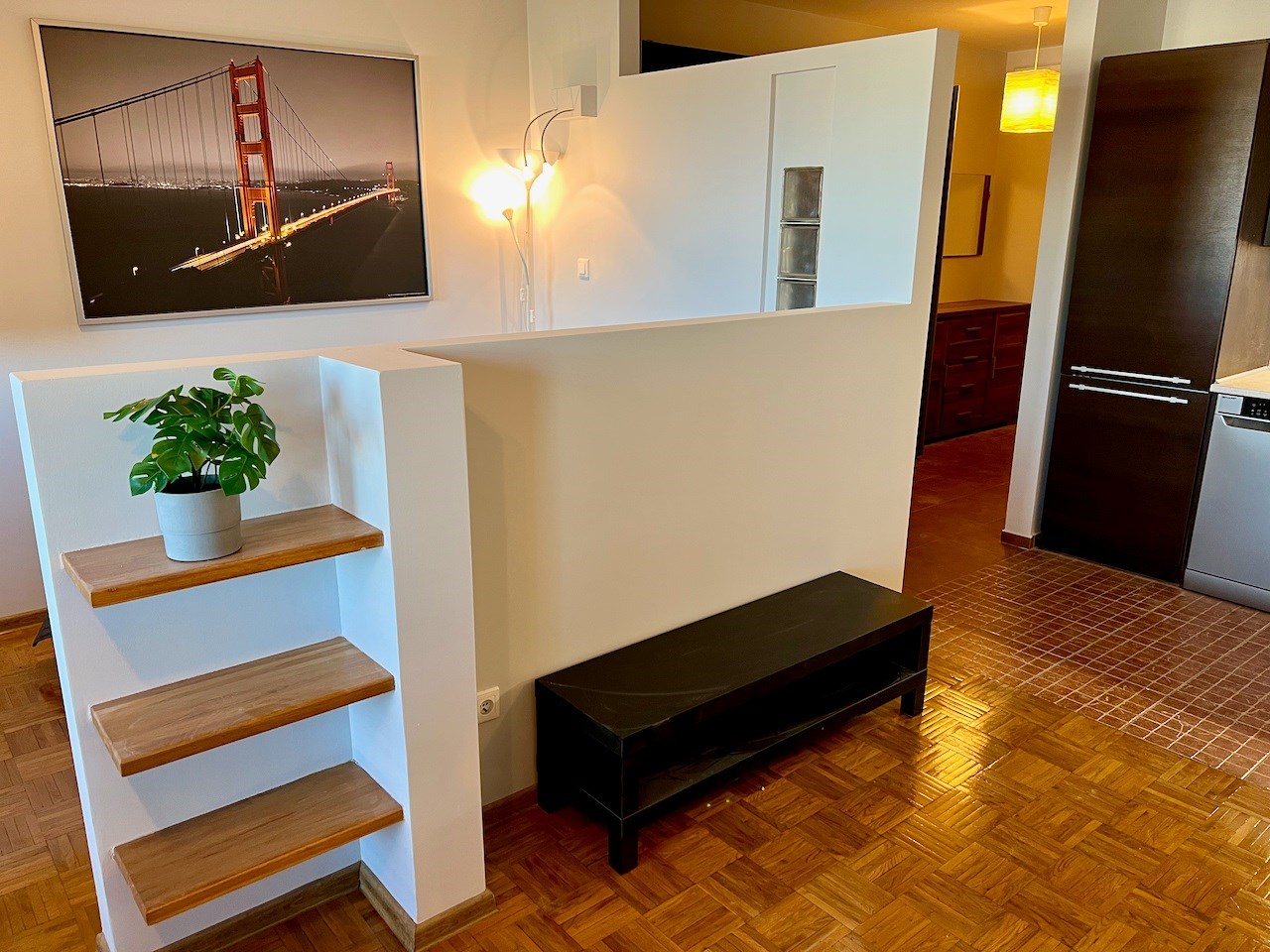 Ten lokal to otwarta przestrzeń - część dzienna z aneksem kuchennym i wydzielony aneks sypialny, ponadto hol i łazienka. Mieszkanie jest całkowicie wyposażone i umeblowane. W pokoju rozkładana kanapa narożna, stół, krzesła, niska szafka RTV, niski stolik, łóżko, szafki. Okna na wschód. W kuchni meble pod wymiar, zabudowana lodówka z zamrażarką, płyta ceramiczna, piekarnik elektryczny, zmywarka, wyciąg. W przedpokoju duża szafa ubraniowa, niska komoda i lustro. W łazience wanna, umywalka, lustro, muszla WC, szafki i pralka.