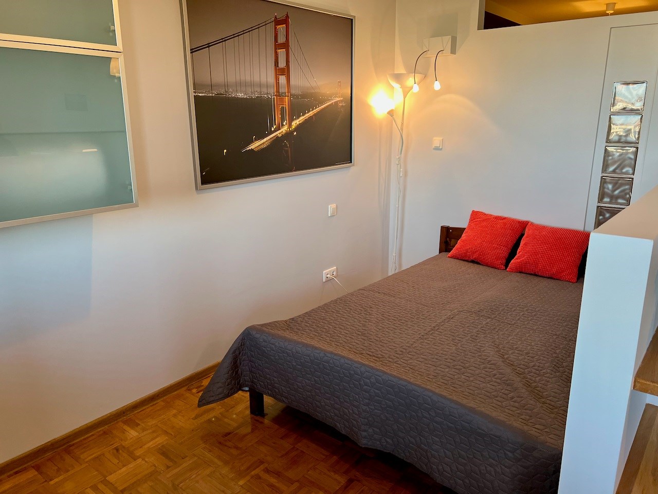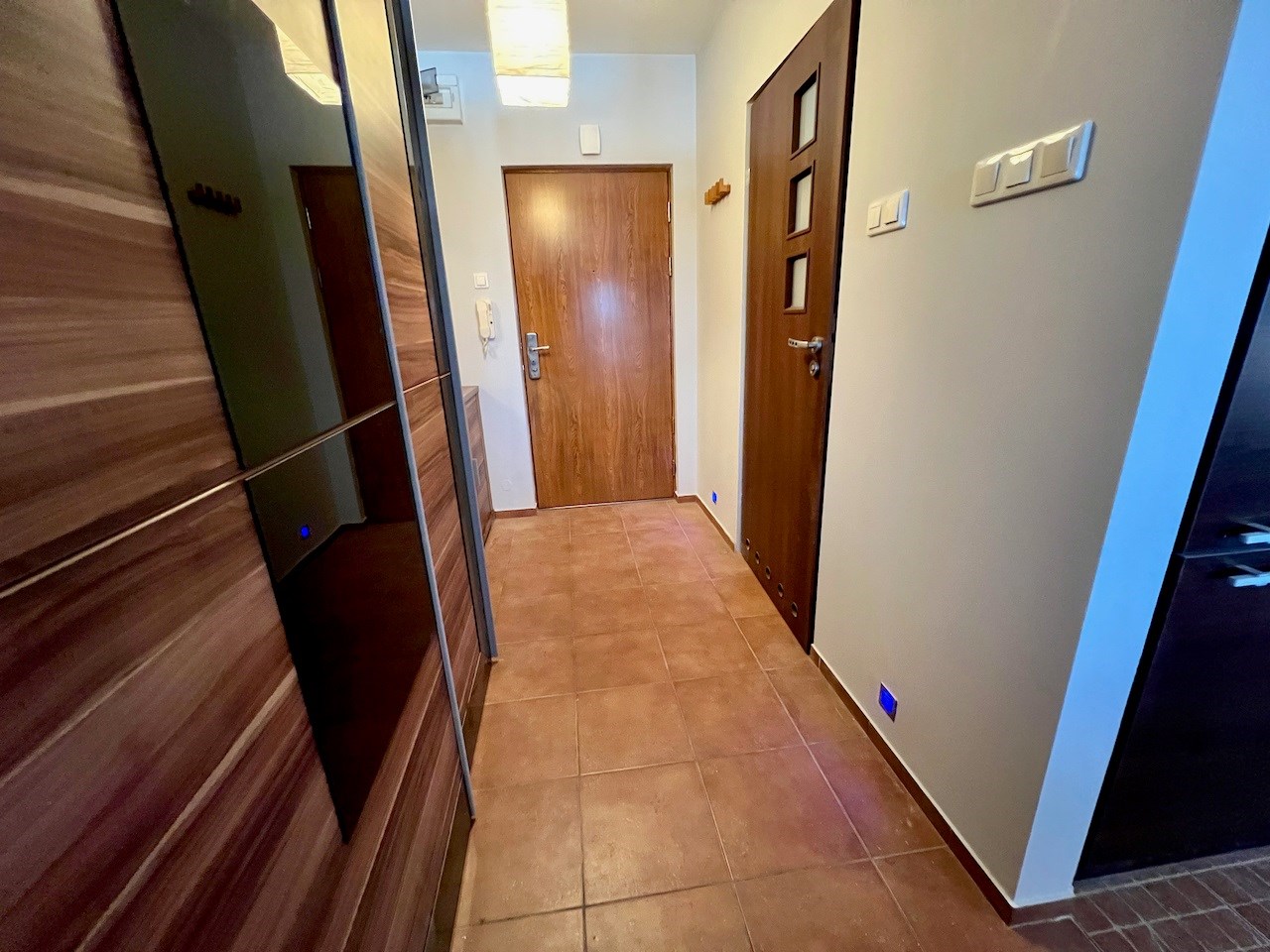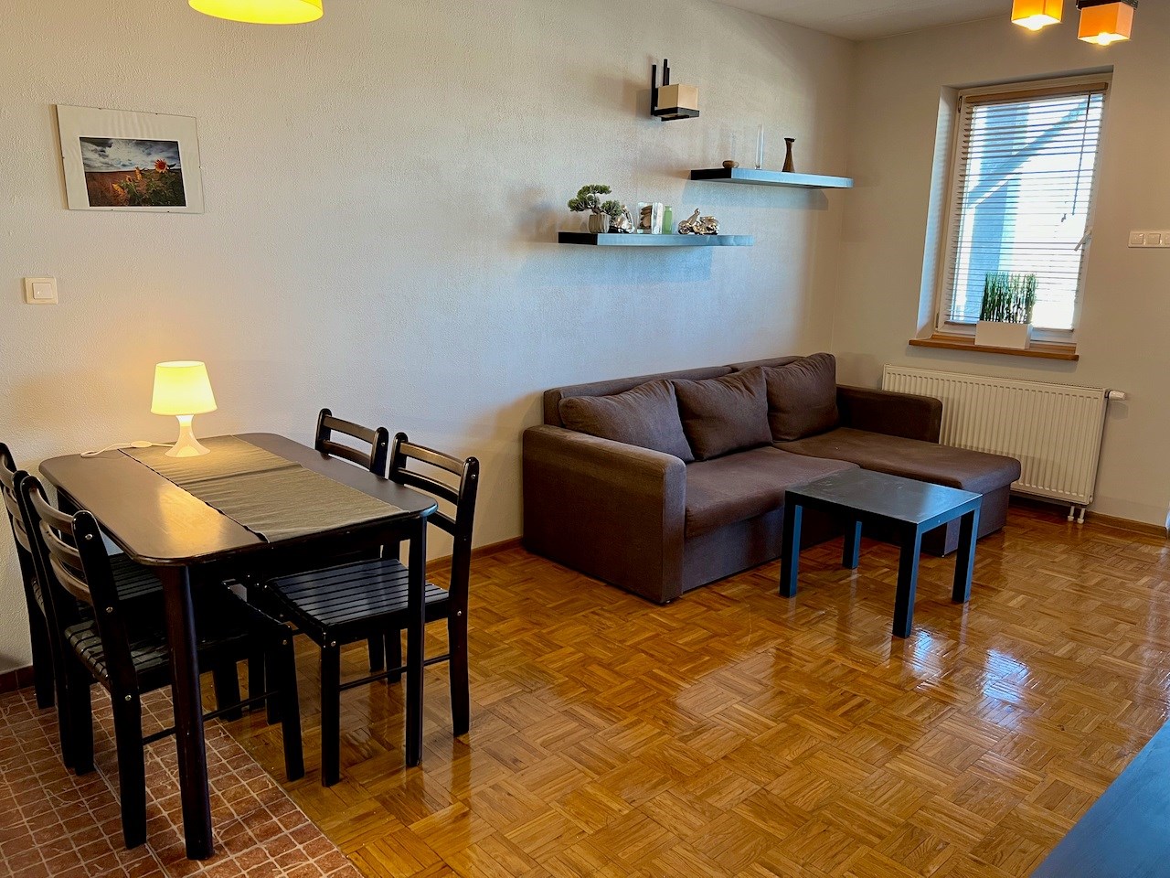 Ten lokal to otwarta przestrzeń - część dzienna z aneksem kuchennym i wydzielony aneks sypialny, ponadto hol i łazienka. Mieszkanie jest całkowicie wyposażone i umeblowane. W pokoju rozkładana kanapa narożna, stół, krzesła, niska szafka RTV, niski stolik, łóżko, szafki. Okna na wschód. W kuchni meble pod wymiar, zabudowana lodówka z zamrażarką, płyta ceramiczna, piekarnik elektryczny, zmywarka, wyciąg. W przedpokoju duża szafa ubraniowa, niska komoda i lustro. W łazience wanna, umywalka, lustro, muszla WC, szafki i pralka.