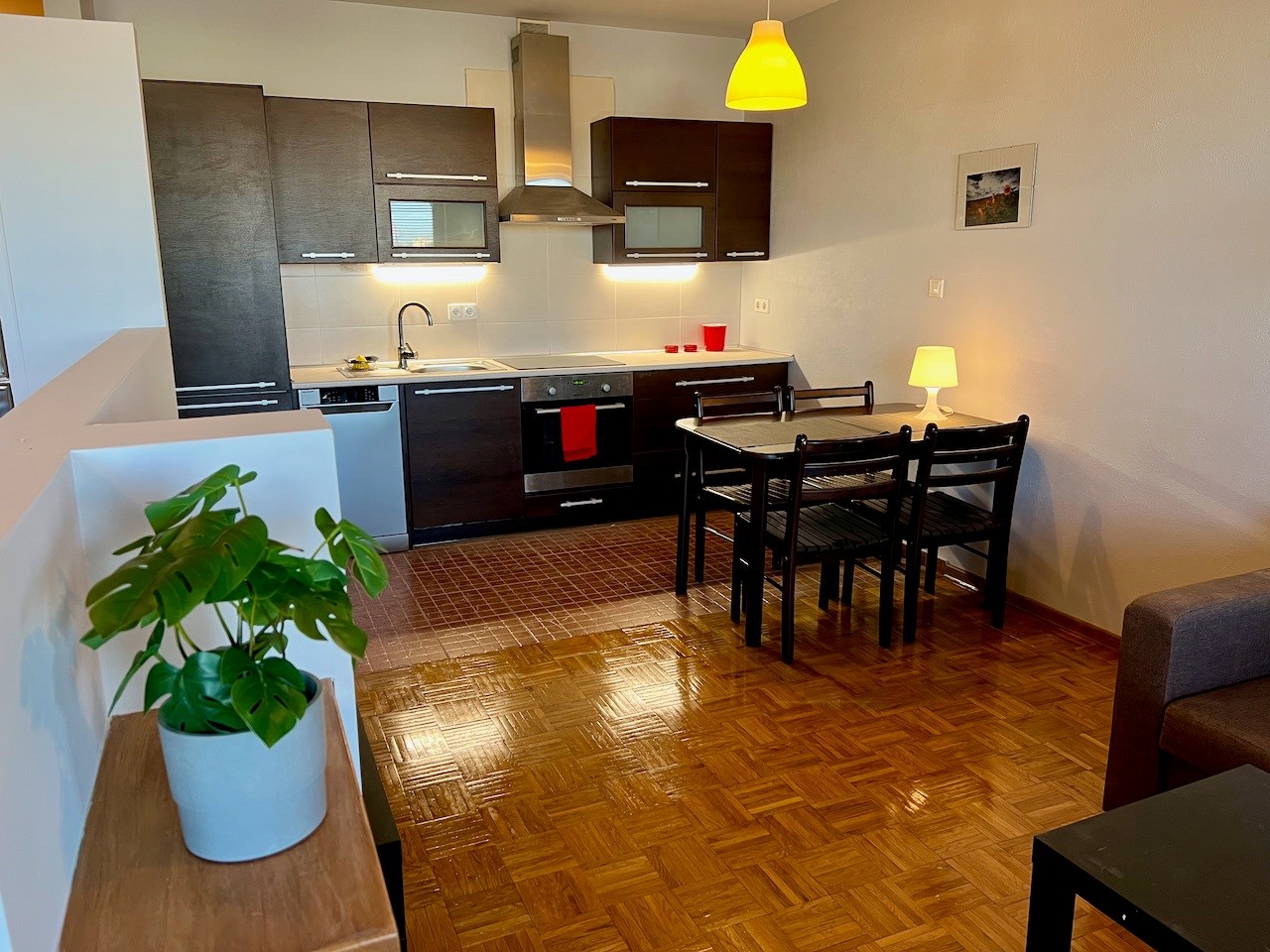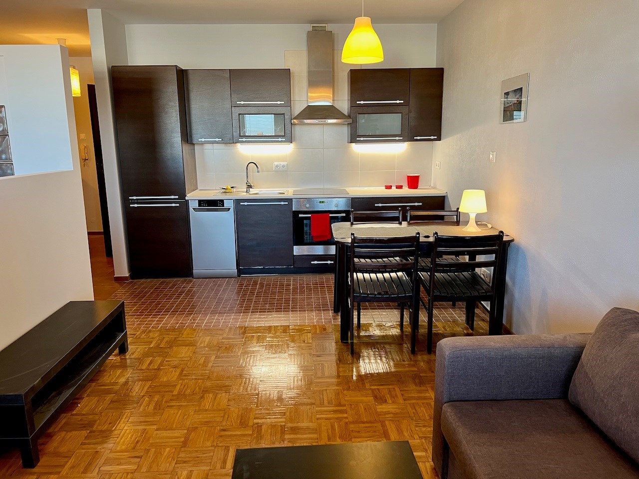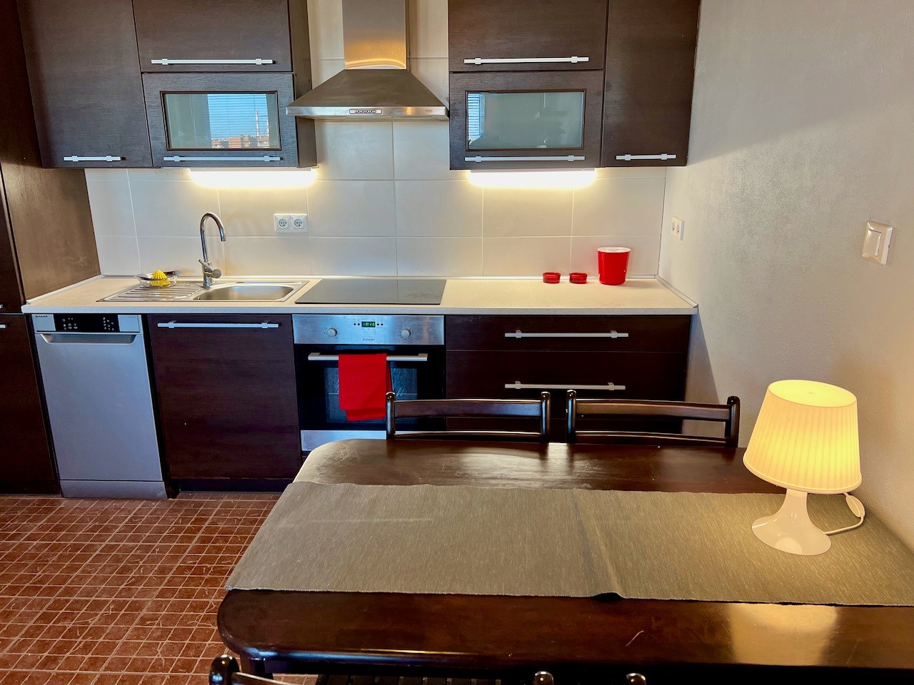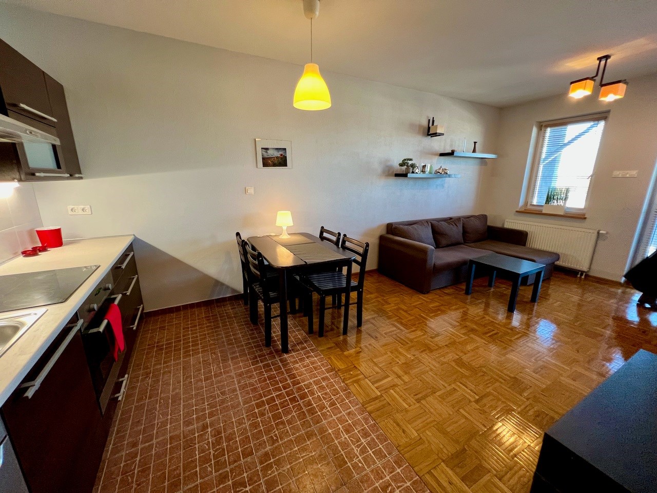 Ten lokal to otwarta przestrzeń - część dzienna z aneksem kuchennym i wydzielony aneks sypialny, ponadto hol i łazienka. Mieszkanie jest całkowicie wyposażone i umeblowane. W pokoju rozkładana kanapa narożna, stół, krzesła, niska szafka RTV, niski stolik, łóżko, szafki. Okna na wschód. W kuchni meble pod wymiar, zabudowana lodówka z zamrażarką, płyta ceramiczna, piekarnik elektryczny, zmywarka, wyciąg. W przedpokoju duża szafa ubraniowa, niska komoda i lustro. W łazience wanna, umywalka, lustro, muszla WC, szafki i pralka.