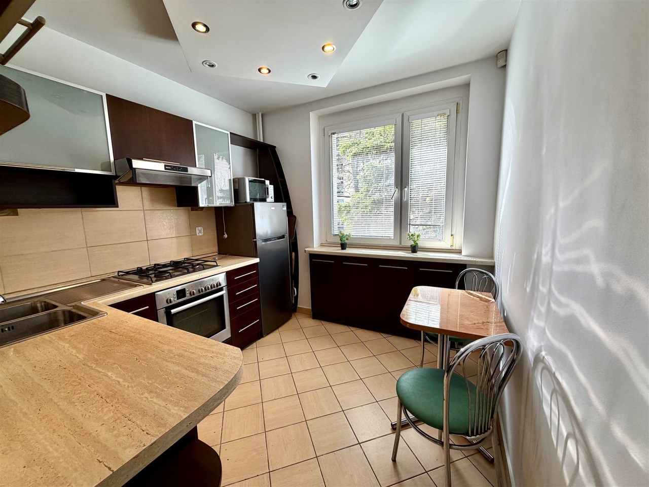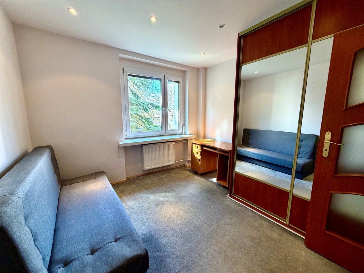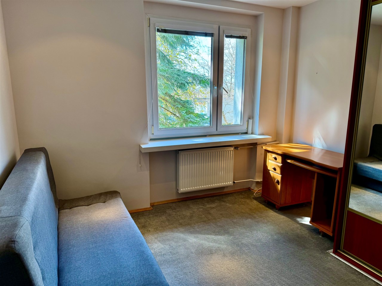 Lokal po malowaniu. Okna wychodzą na zachód. Pokoje są rozkładowe - w większym pokoju wypoczynek ze skóry (sofa z funkcją spania), stół z krzesłami, komoda, szafka RTV, telewizor i wyjście na balkon, na podłodze parkiet. W mniejszym pokoju rozkładana kanap, duża szafa i biurko, a na podłodze wykładzina dywanowa. W kuchni meble w zabudowie, lodówko-zamrażarka, płyta gazowa, piekarnik elektryczny, mikrofala, wyciąg i miejsce na zmywarkę. W łazience wanna, pralka, umywalka. W przedpokoju szafa pod wymiar. Samochód można zaparkować pod domem. Możliwość korzystania z komórki w piwnicy.