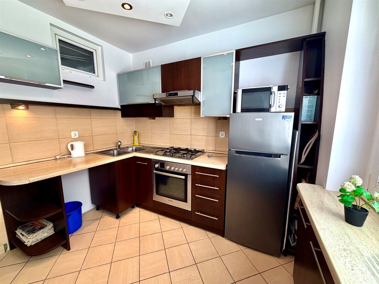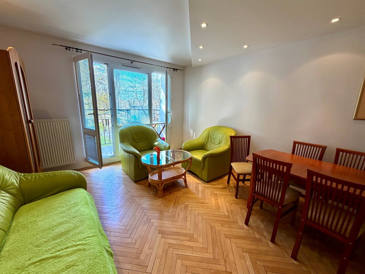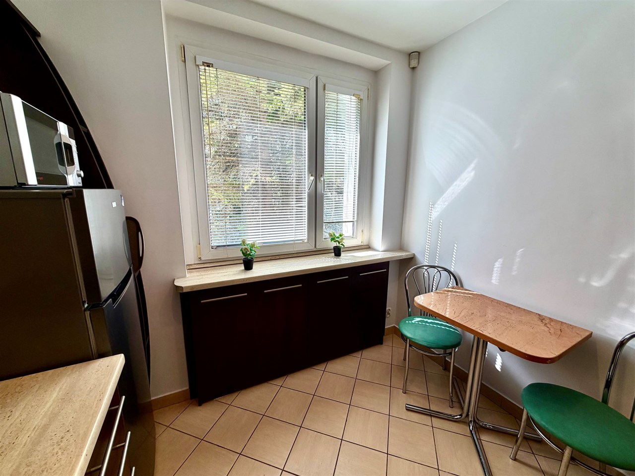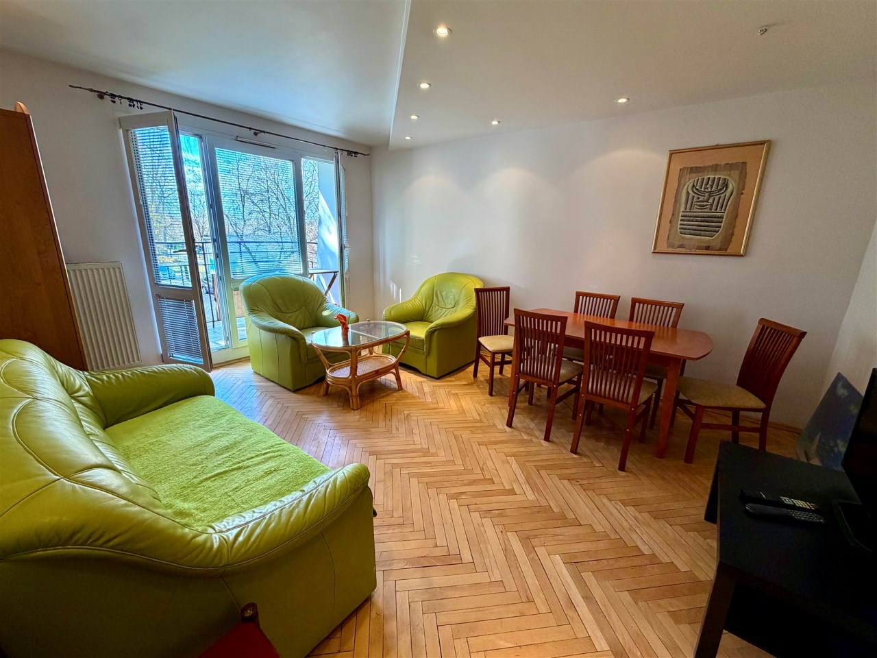 Lokal po malowaniu. Okna wychodzą na zachód. Pokoje są rozkładowe - w większym pokoju wypoczynek ze skóry (sofa z funkcją spania), stół z krzesłami, komoda, szafka RTV, telewizor i wyjście na balkon, na podłodze parkiet. W mniejszym pokoju rozkładana kanap, duża szafa i biurko, a na podłodze wykładzina dywanowa. W kuchni meble w zabudowie, lodówko-zamrażarka, płyta gazowa, piekarnik elektryczny, mikrofala, wyciąg i miejsce na zmywarkę. W łazience wanna, pralka, umywalka. W przedpokoju szafa pod wymiar. Samochód można zaparkować pod domem. Możliwość korzystania z komórki w piwnicy.