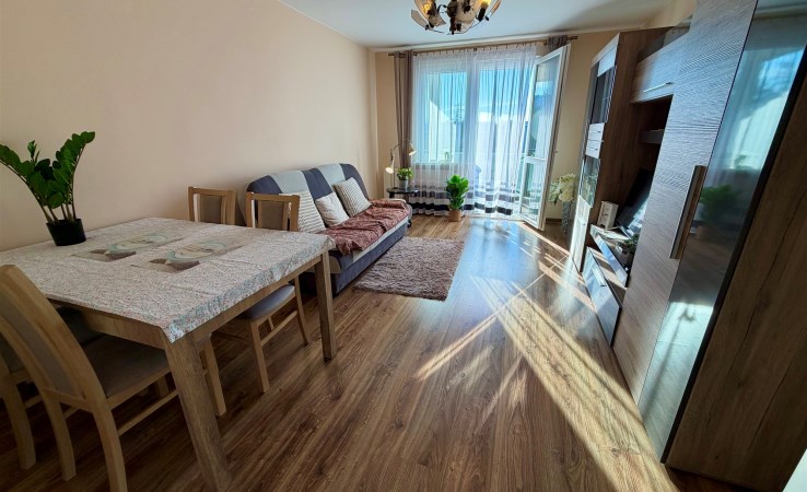 Pokój dzienny ma około 18 m2 - jest tutaj wygodna sofa, rozkładany stół i 4 krzesła, telewizor i szafka telewizyjna i wyjście na balkon z wystawą na zachód. W jednej sypialni mamy łóżko dwu osobowe i szafę wnękową pod wymiar. W drugiej sypialni rozkładana kanapa, komoda z szufladami i szafa. W kuchni meble w zabudowie, sprzęt AGD - płyta indukcyjna, piekarnik, lodówko-zamrażarka, pochłaniacz. Okno z wystawą na wschód. Łazienka z kabiną prysznicową, pralką, toaletą i umywalką na szafce. W przedpokoju duża szafa pod wymiar. Lokatorzy mogą również korzystać z piwnicy.