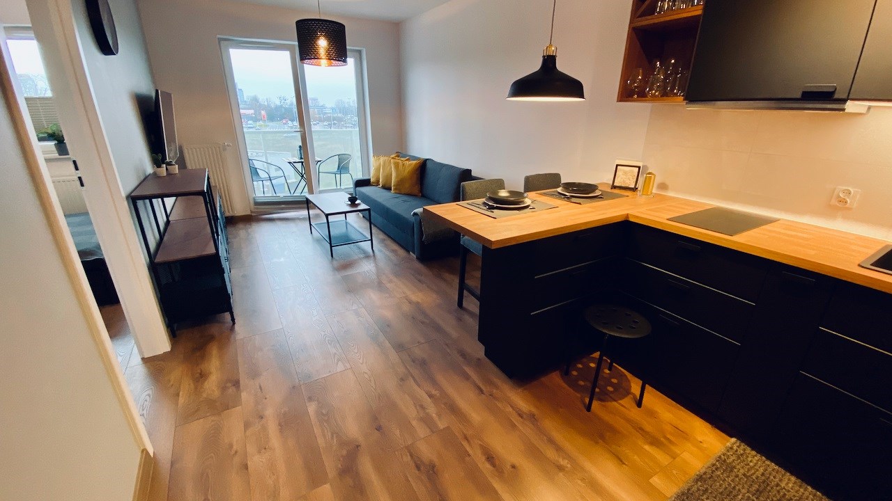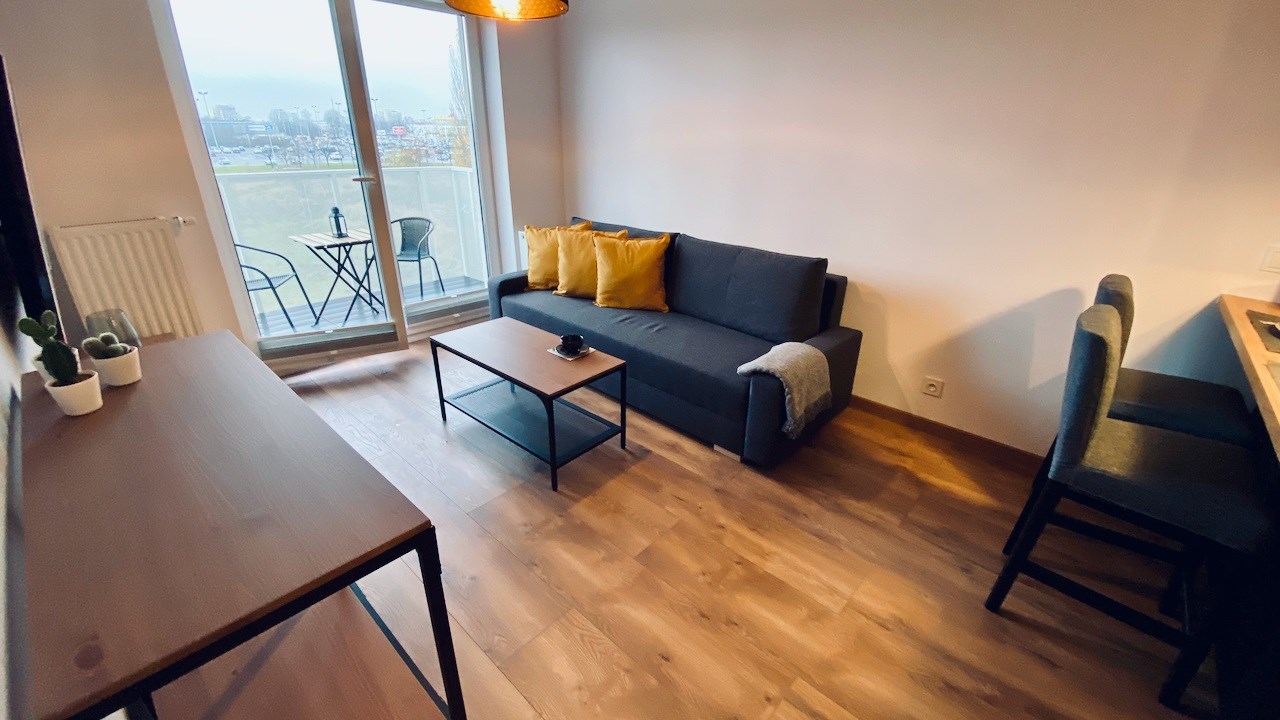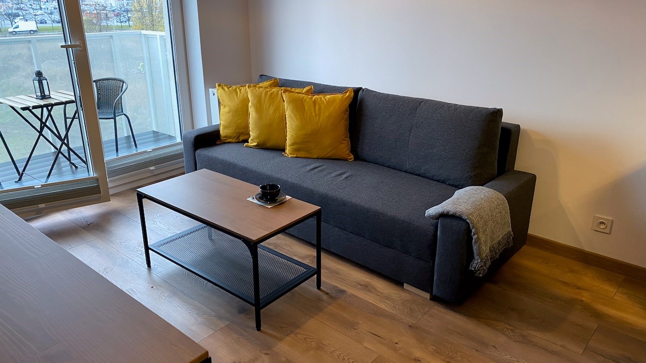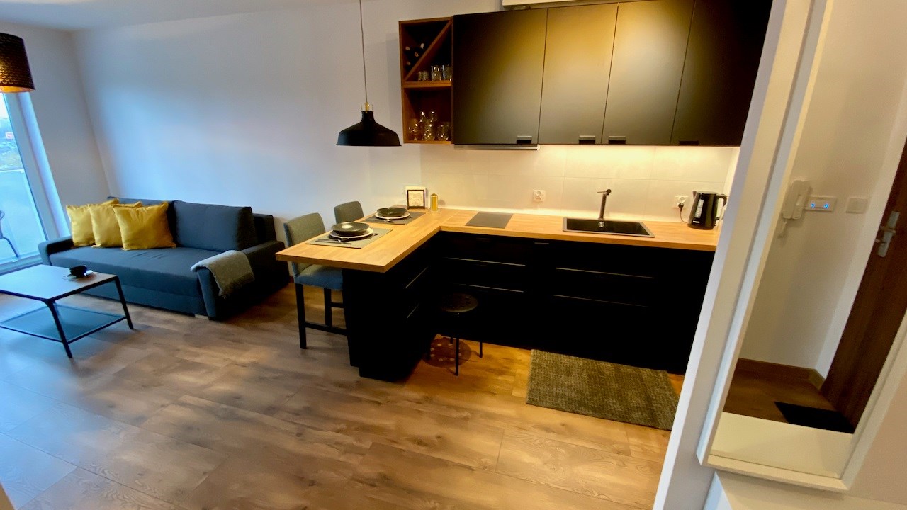 W mieszkaniu mamy wygodny salon z aneksem kuchennym, osobną sypialnię, łazienkę i hol. Jest tutaj kompletnie umeblowana i wyposażona kuchnia - meble pod wymiar, lodówko-zamrażarka, zmywarka, płyta indukcyjna, piekarnik, mikrofala i wyciąg. Drobne wyposażenie. W pokoju dziennym rozkładana sofa, komody, telewizor LCD Smart, niski stolik kawowy i wyjście na słoneczny balkon. W sypialni duża szafa, łóżko dwu osobowe i stoliki nocne. Łazienka z nowoczesną aranżacją z kabiną prysznicową, toaletą, umywalką i pralką. Hol z wieszakami.