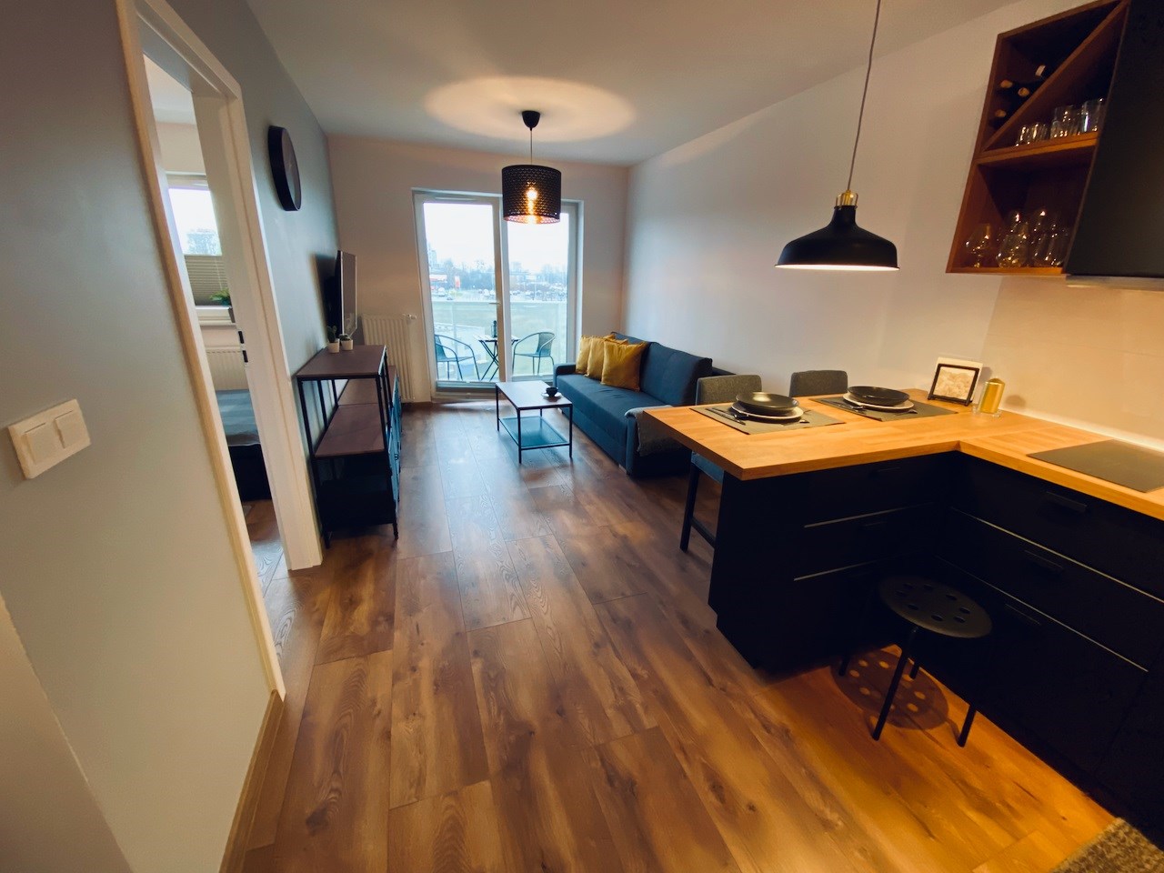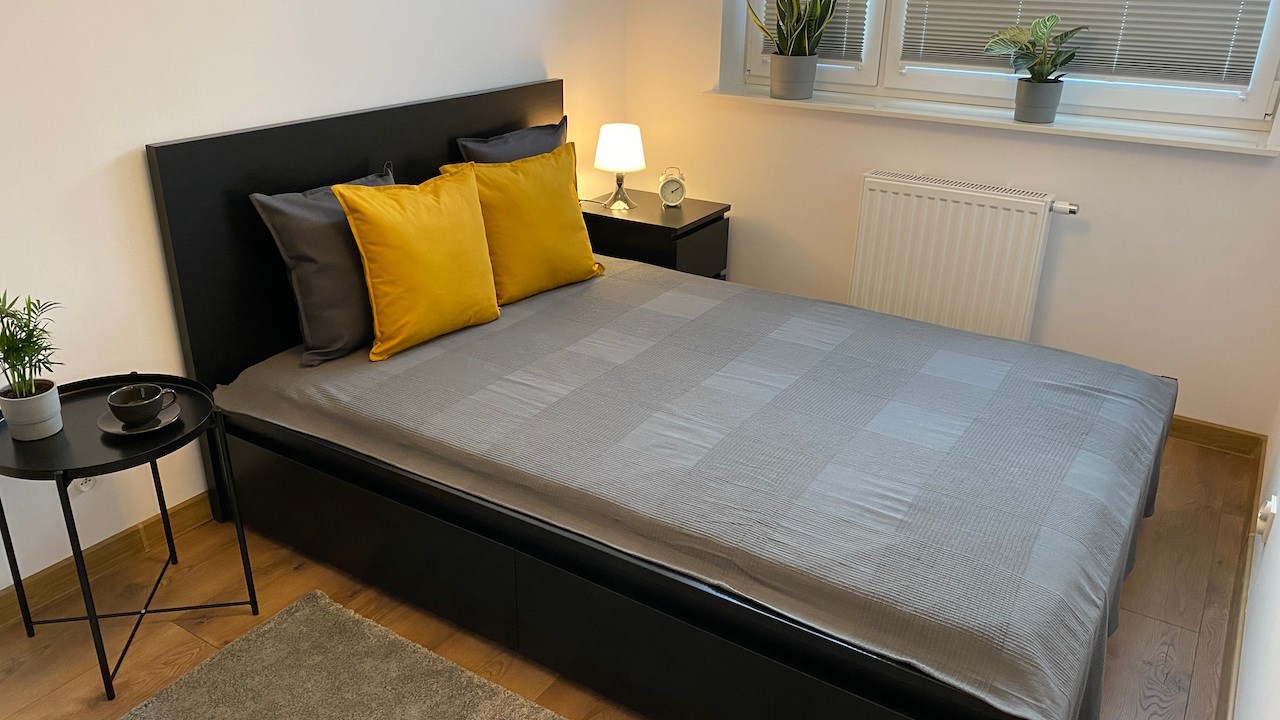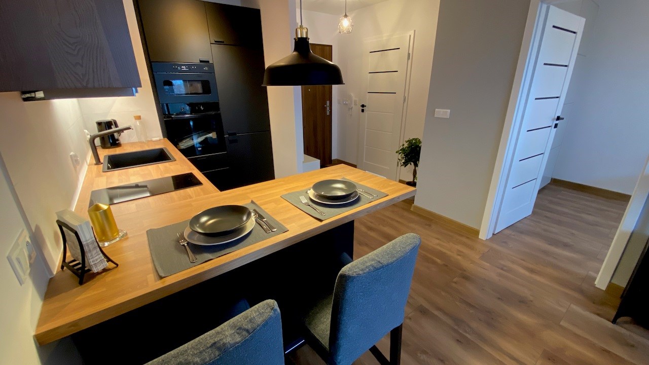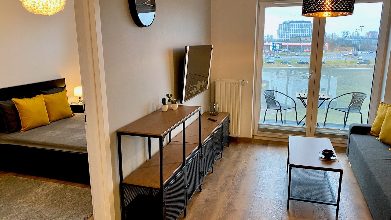 W mieszkaniu mamy wygodny salon z aneksem kuchennym, osobną sypialnię, łazienkę i hol. Jest tutaj kompletnie umeblowana i wyposażona kuchnia - meble pod wymiar, lodówko-zamrażarka, zmywarka, płyta indukcyjna, piekarnik, mikrofala i wyciąg. Drobne wyposażenie. W pokoju dziennym rozkładana sofa, komody, telewizor LCD Smart, niski stolik kawowy i wyjście na słoneczny balkon. W sypialni duża szafa, łóżko dwu osobowe i stoliki nocne. Łazienka z nowoczesną aranżacją z kabiną prysznicową, toaletą, umywalką i pralką. Hol z wieszakami.