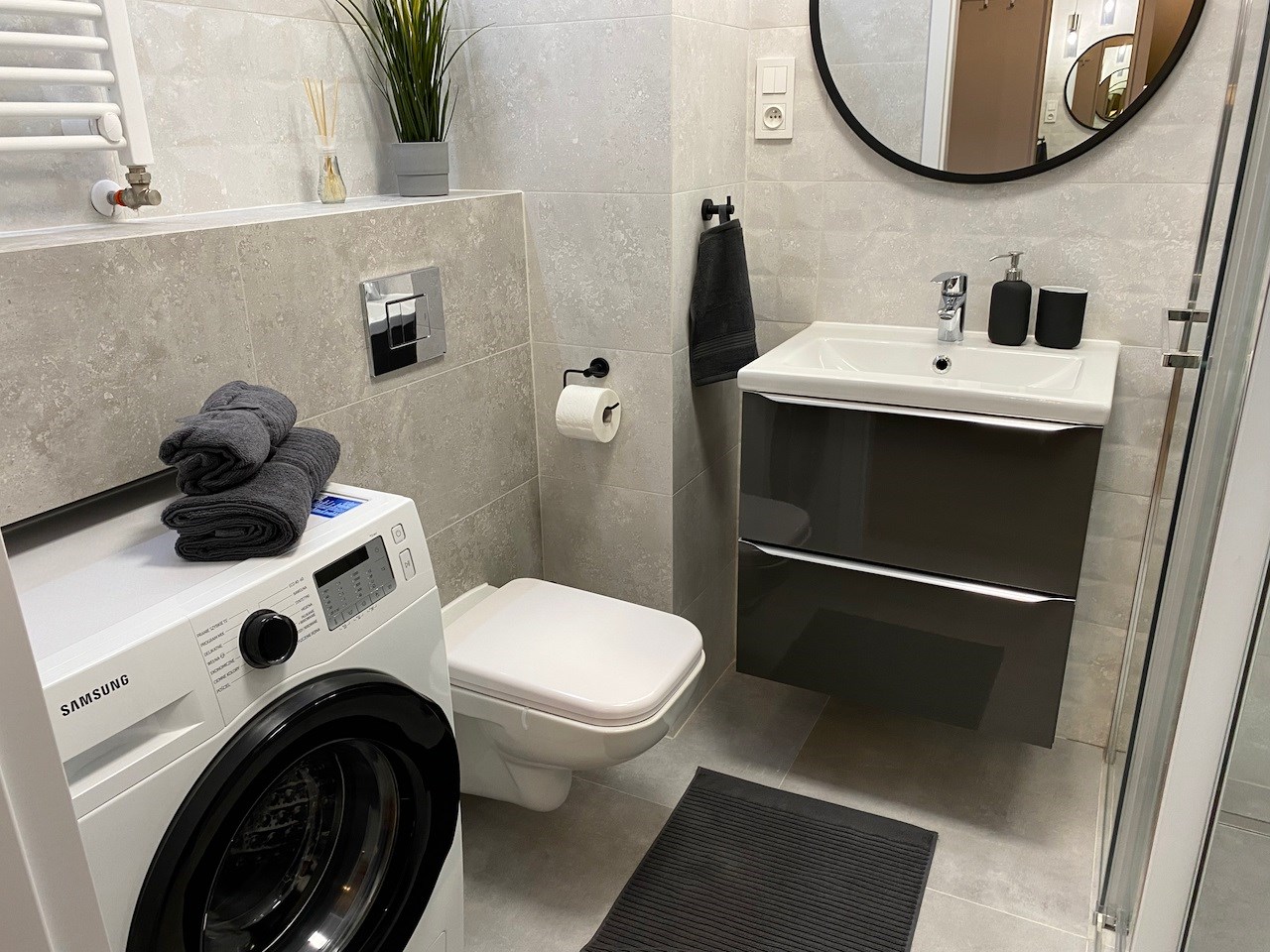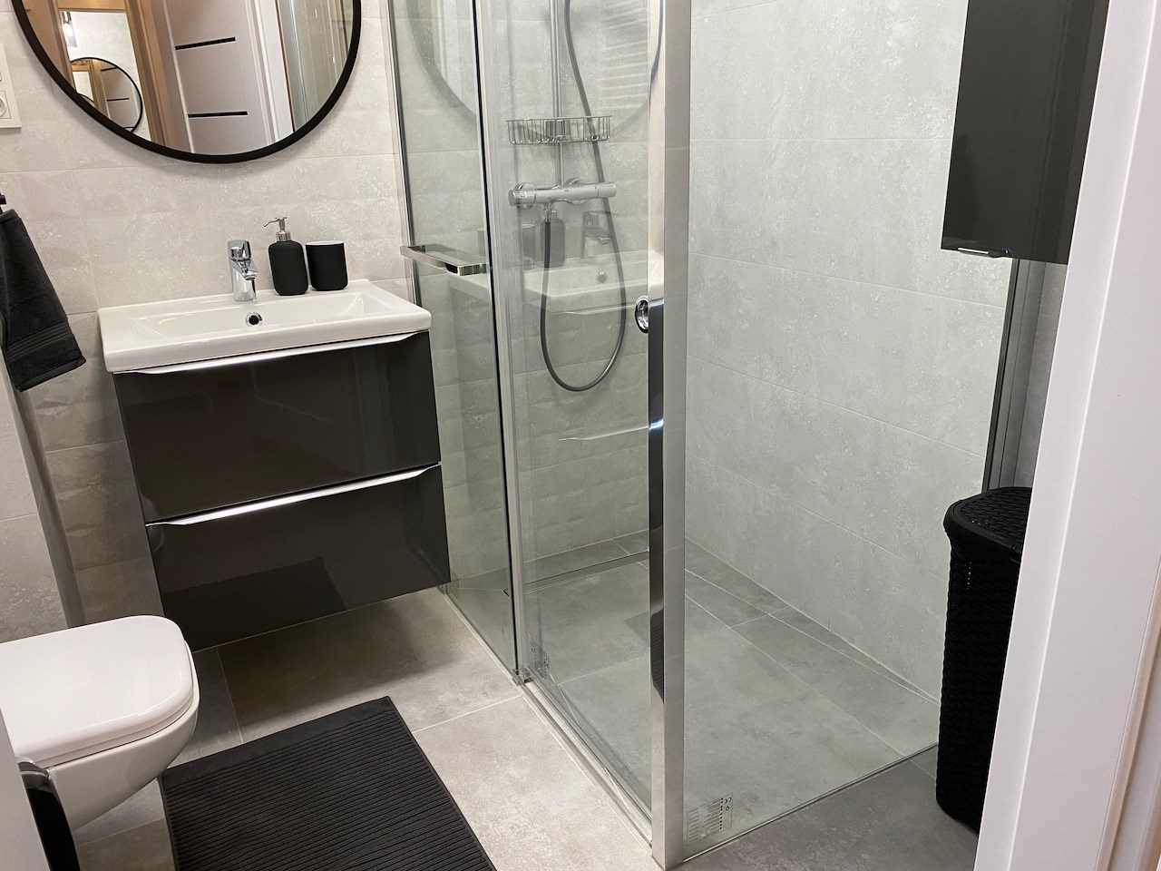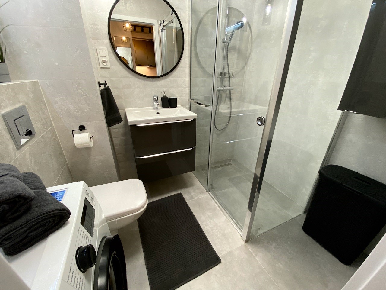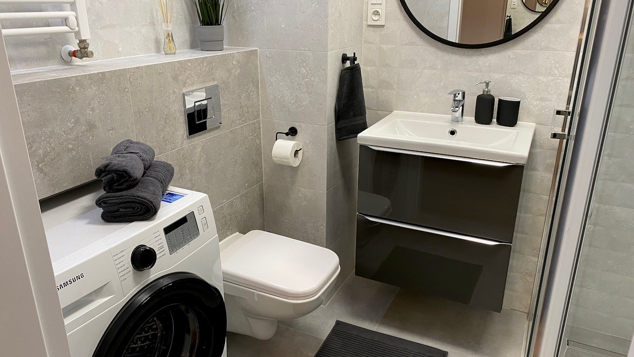 | Wyposażenie łazienki | kabina prysznicowa, lustro, pralka, umywalka, WC |