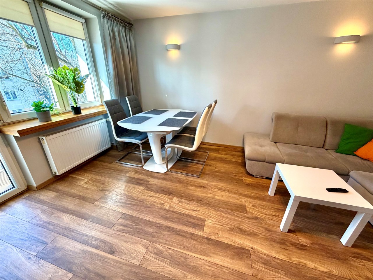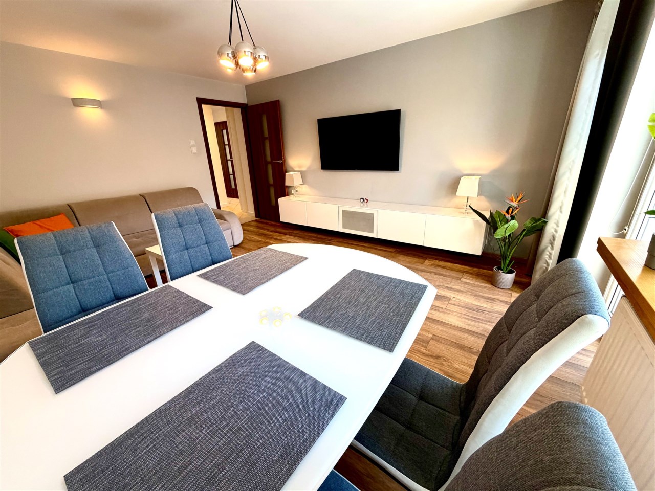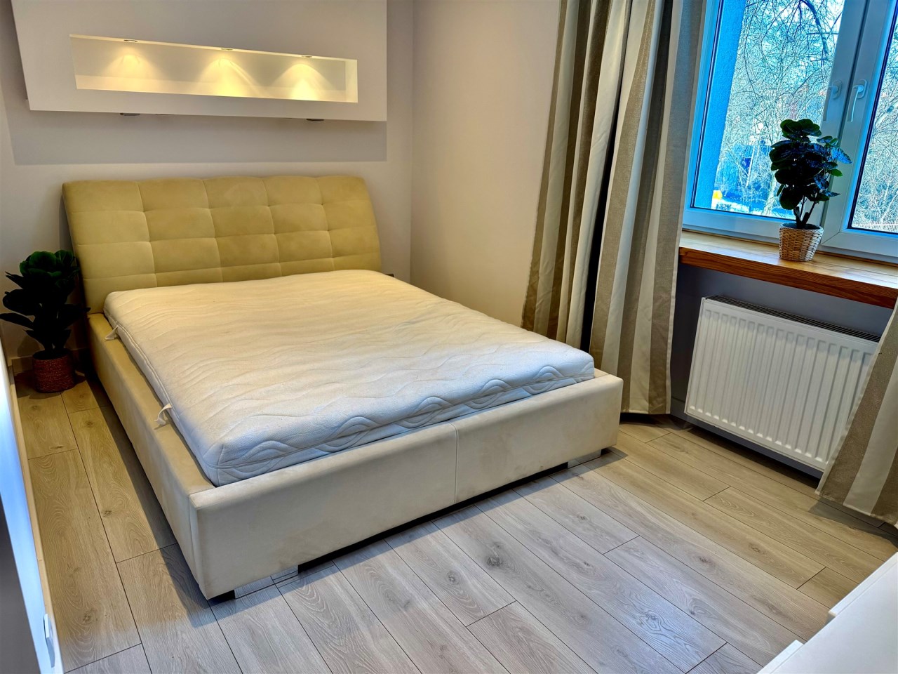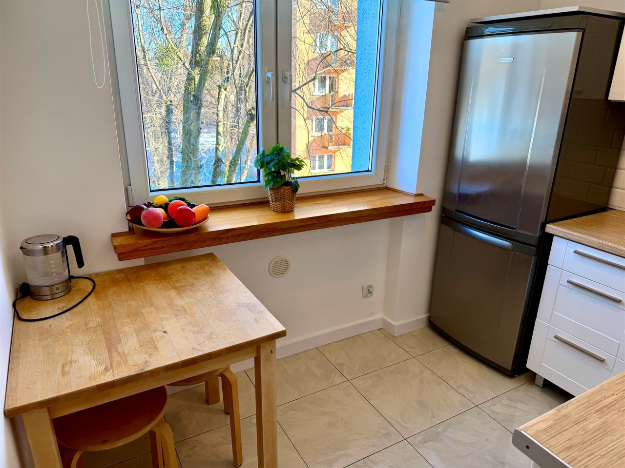 Pokój dzienny ma około 18 m2 - jest tutaj wygodna sofa, rozkładany stół i 4 krzesła, telewizor i szafka telewizyjna i wyjście na balkon z wystawą na zachód. W jednej sypialni mamy łóżko dwu osobowe i szafę wnękową pod wymiar. W drugiej sypialni rozkładana kanapa, komoda z szufladami i szafa. W kuchni meble w zabudowie, sprzęt AGD - płyta indukcyjna, piekarnik, lodówko-zamrażarka, pochłaniacz. Okno z wystawą na wschód. Łazienka z kabiną prysznicową, pralką, toaletą i umywalką na szafce. W przedpokoju duża szafa pod wymiar. Lokatorzy mogą również korzystać z piwnicy.