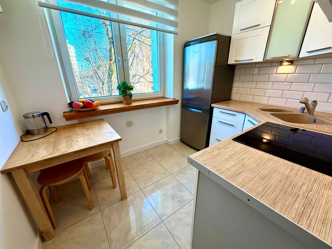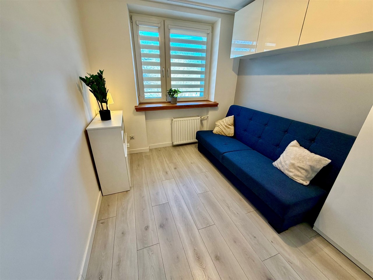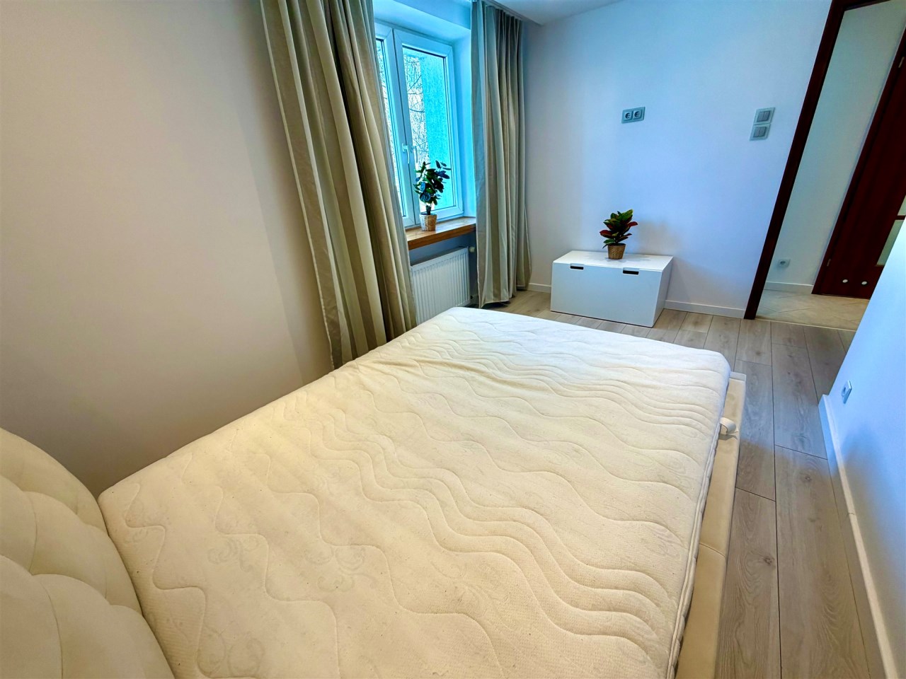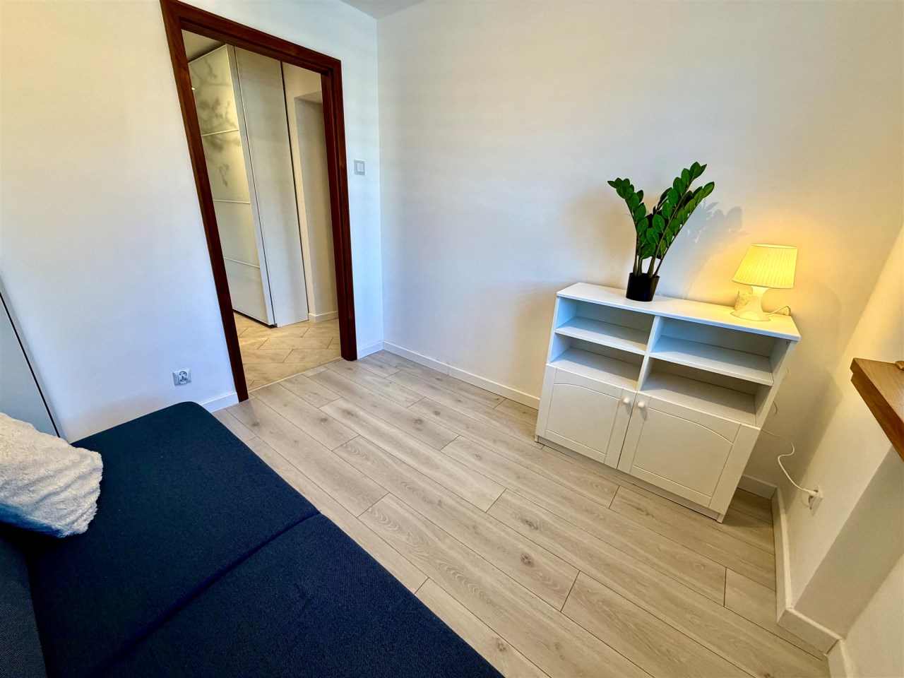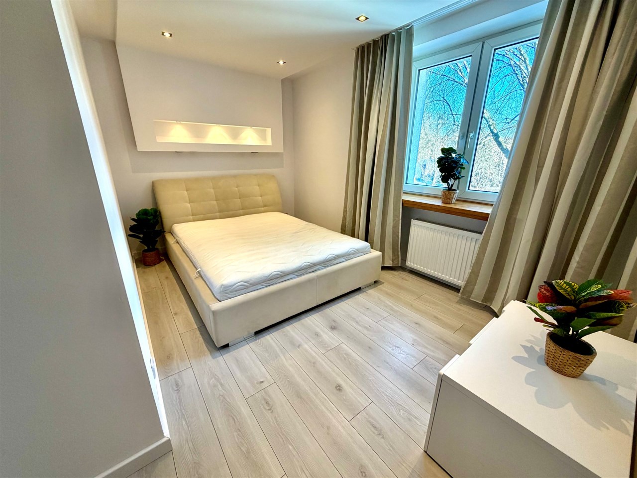 Pokój dzienny ma około 18 m2 - jest tutaj wygodna sofa, rozkładany stół i 4 krzesła, telewizor i szafka telewizyjna i wyjście na balkon z wystawą na zachód. W jednej sypialni mamy łóżko dwu osobowe i szafę wnękową pod wymiar. W drugiej sypialni rozkładana kanapa, komoda z szufladami i szafa. W kuchni meble w zabudowie, sprzęt AGD - płyta indukcyjna, piekarnik, lodówko-zamrażarka, pochłaniacz. Okno z wystawą na wschód. Łazienka z kabiną prysznicową, pralką, toaletą i umywalką na szafce. W przedpokoju duża szafa pod wymiar. Lokatorzy mogą również korzystać z piwnicy.