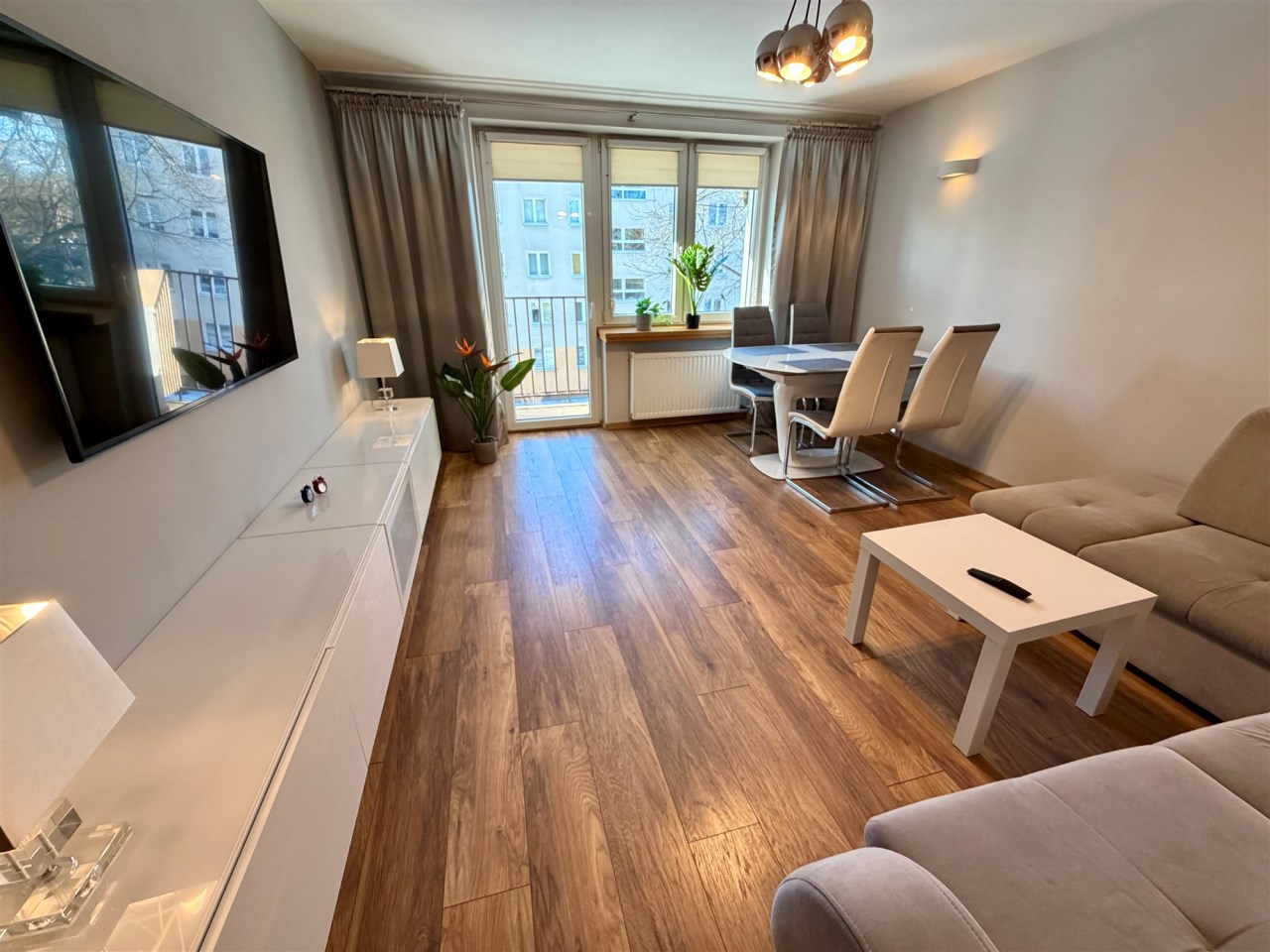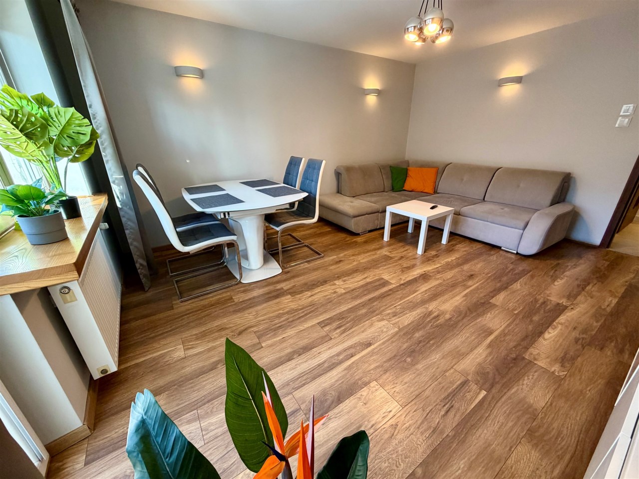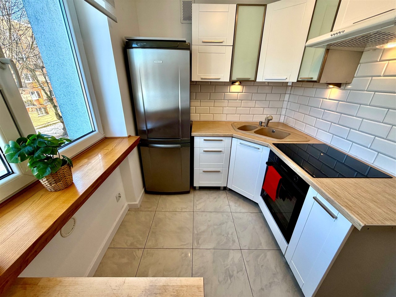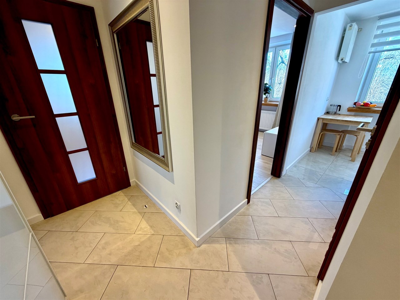 Pokój dzienny ma około 18 m2 - jest tutaj wygodna sofa, rozkładany stół i 4 krzesła, telewizor i szafka telewizyjna i wyjście na balkon z wystawą na zachód. W jednej sypialni mamy łóżko dwu osobowe i szafę wnękową pod wymiar. W drugiej sypialni rozkładana kanapa, komoda z szufladami i szafa. W kuchni meble w zabudowie, sprzęt AGD - płyta indukcyjna, piekarnik, lodówko-zamrażarka, pochłaniacz. Okno z wystawą na wschód. Łazienka z kabiną prysznicową, pralką, toaletą i umywalką na szafce. W przedpokoju duża szafa pod wymiar. Lokatorzy mogą również korzystać z piwnicy.