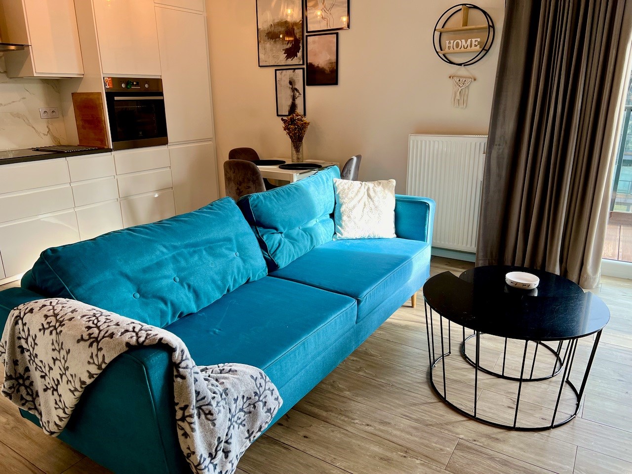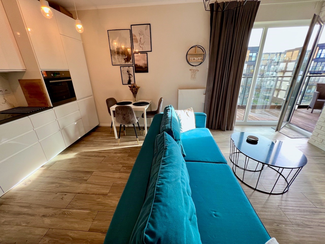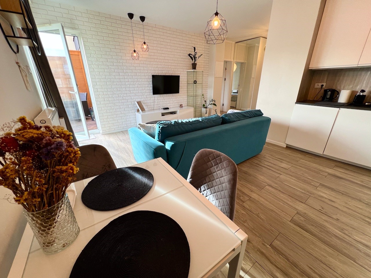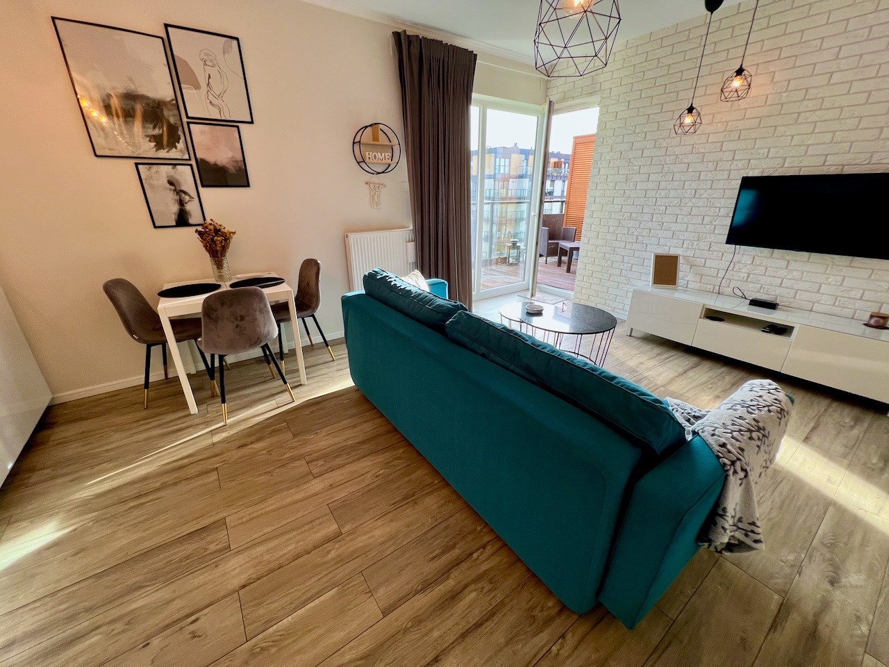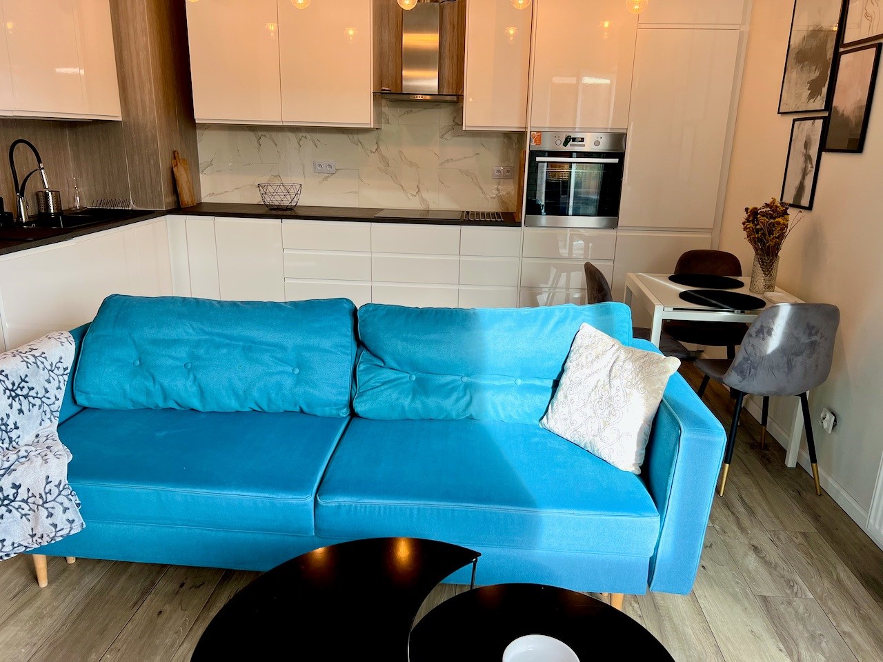 W lokalu jest przestronny salon z aneksem kuchennym, osobna sypialnia, łazienka i hol. Wszystkie sprzęty i urządzenia są nowoczesne. Jest tutaj kompletnie umeblowana i wyposażona kuchnia - meble pod wymiar, lodówko-zamrażarka, zmywarka, pralka, płyta ceramiczna, piekarnik, wyciąg i rozkładany stół z krzesłami. W pokoju dziennym rozkładana sofa, komody, telewizor LCD Smart, niskie stoliki kawowe i wyjście na duży narożny balkon, gdzie jest zestaw wypoczynkowy (dwa fotele i stolik). W sypialni duża szafa, łóżko dwu osobowe, biurko i stolik nocny. Łazienka z nowoczesną aranżacją z kabiną prysznicową, toaletą i umywalką. Hol z szafą i wieszakiem. Do dyspozycji również komórka lokatorska.