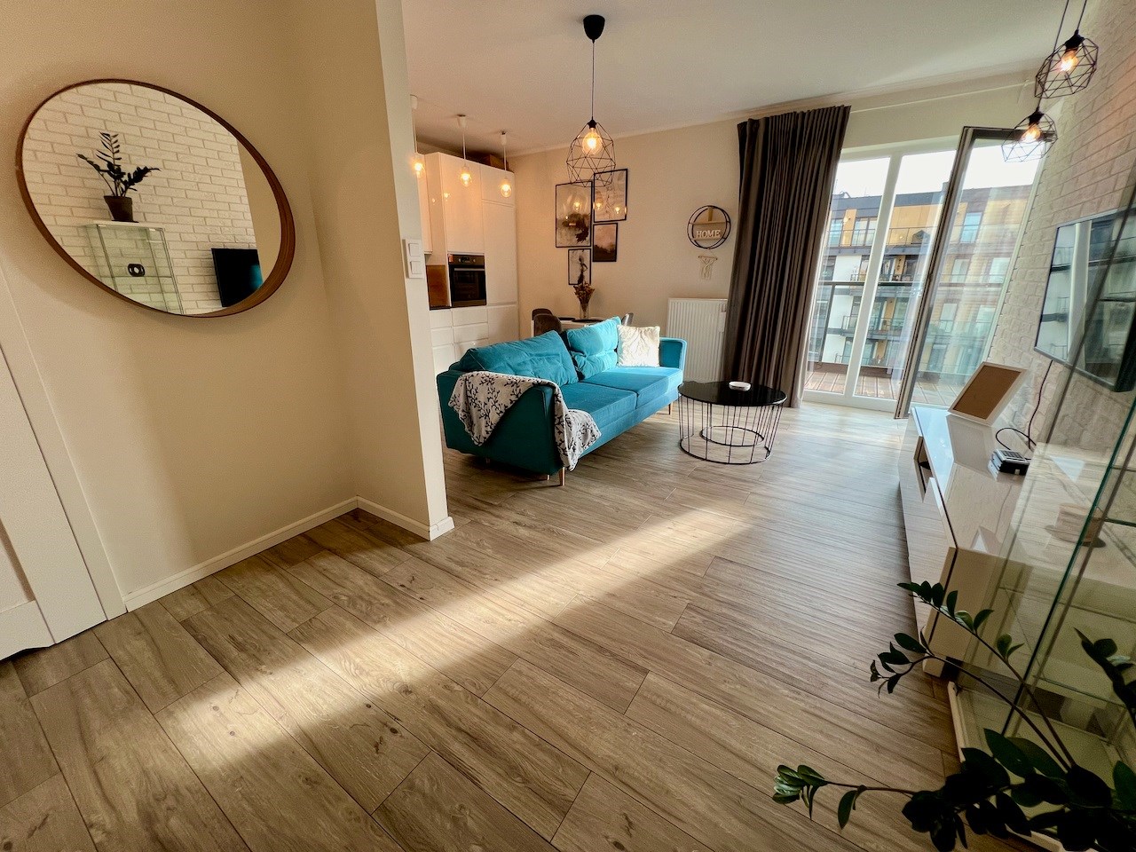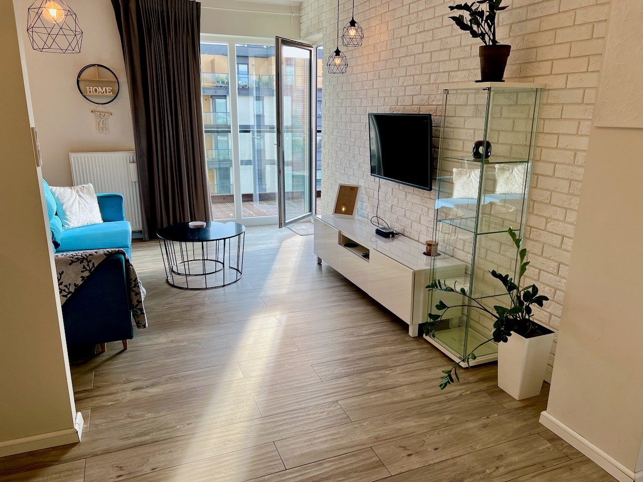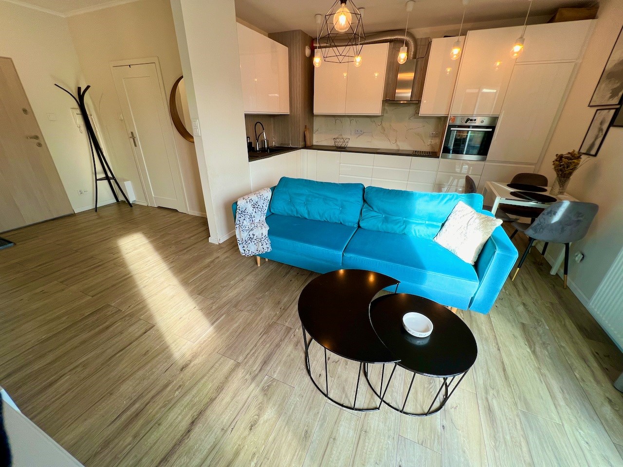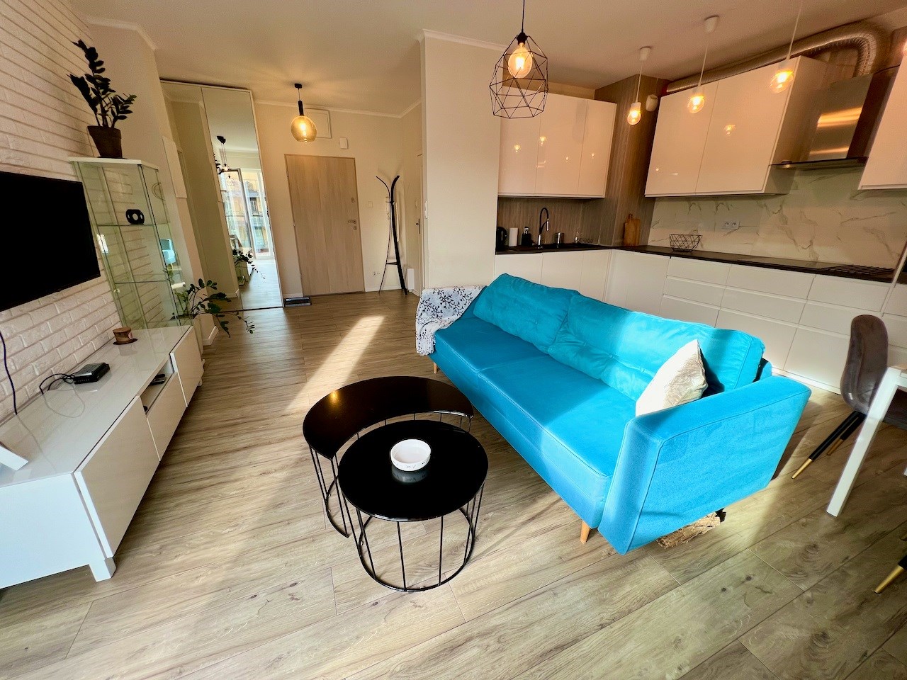 W lokalu jest przestronny salon z aneksem kuchennym, osobna sypialnia, łazienka i hol. Wszystkie sprzęty i urządzenia są nowoczesne. Jest tutaj kompletnie umeblowana i wyposażona kuchnia - meble pod wymiar, lodówko-zamrażarka, zmywarka, pralka, płyta ceramiczna, piekarnik, wyciąg i rozkładany stół z krzesłami. W pokoju dziennym rozkładana sofa, komody, telewizor LCD Smart, niskie stoliki kawowe i wyjście na duży narożny balkon, gdzie jest zestaw wypoczynkowy (dwa fotele i stolik). W sypialni duża szafa, łóżko dwu osobowe, biurko i stolik nocny. Łazienka z nowoczesną aranżacją z kabiną prysznicową, toaletą i umywalką. Hol z szafą i wieszakiem. Do dyspozycji również komórka lokatorska.