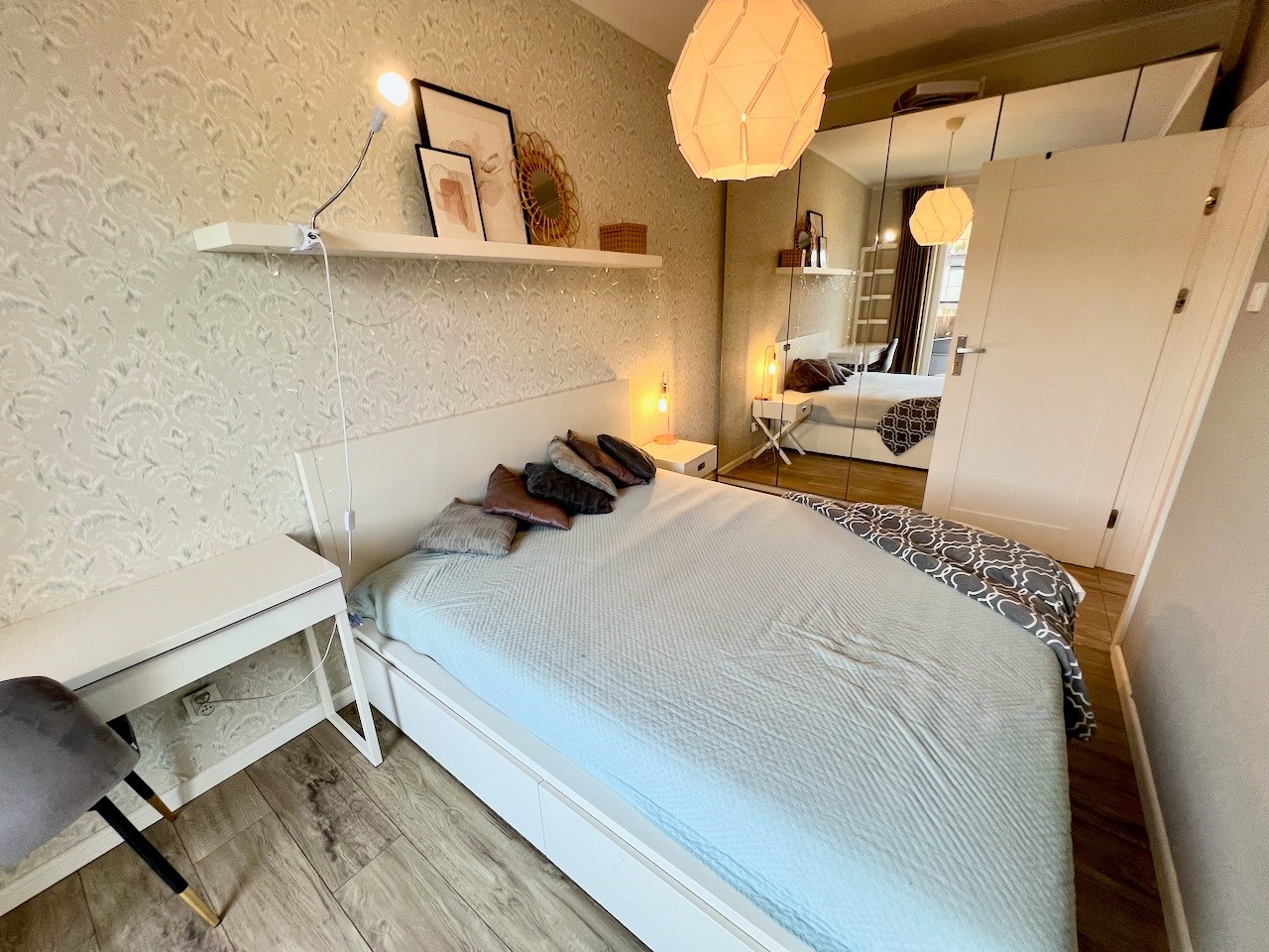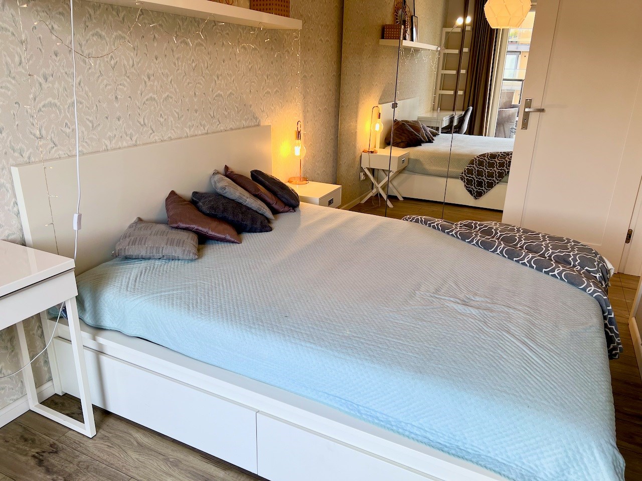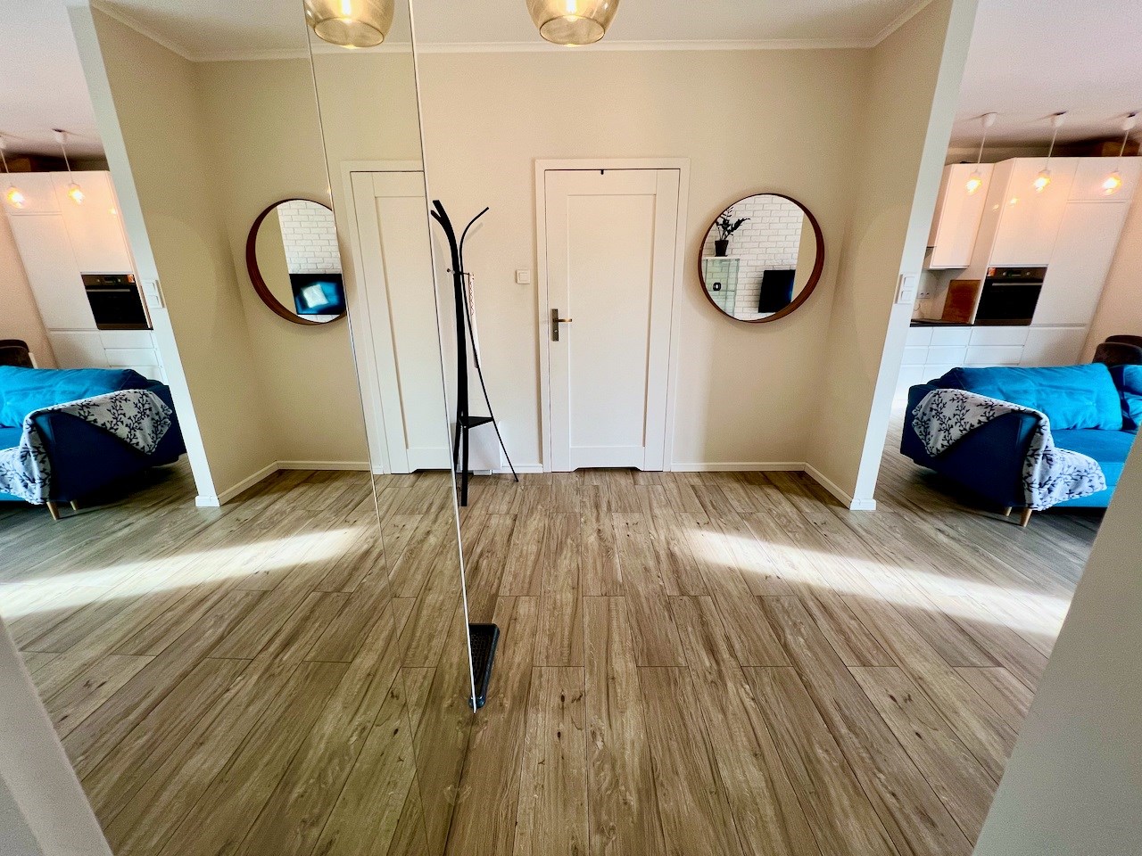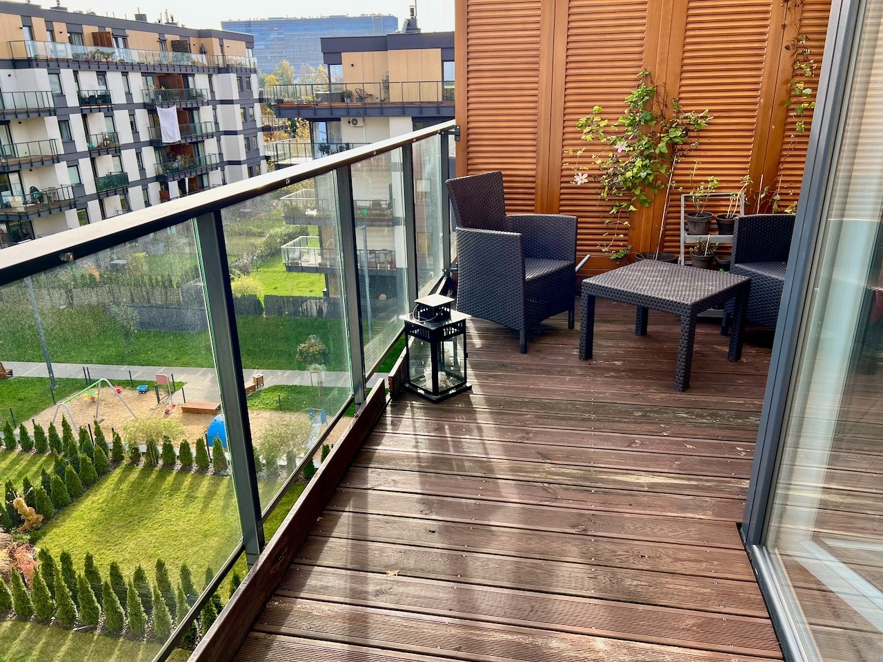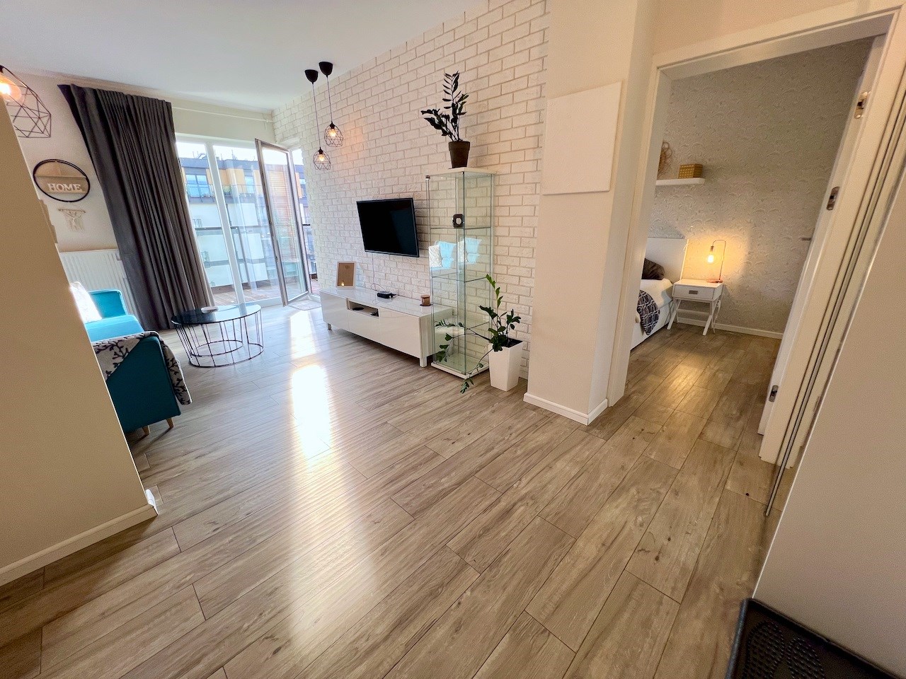 W lokalu jest przestronny salon z aneksem kuchennym, osobna sypialnia, łazienka i hol. Wszystkie sprzęty i urządzenia są nowoczesne. Jest tutaj kompletnie umeblowana i wyposażona kuchnia - meble pod wymiar, lodówko-zamrażarka, zmywarka, pralka, płyta ceramiczna, piekarnik, wyciąg i rozkładany stół z krzesłami. W pokoju dziennym rozkładana sofa, komody, telewizor LCD Smart, niskie stoliki kawowe i wyjście na duży narożny balkon, gdzie jest zestaw wypoczynkowy (dwa fotele i stolik). W sypialni duża szafa, łóżko dwu osobowe, biurko i stolik nocny. Łazienka z nowoczesną aranżacją z kabiną prysznicową, toaletą i umywalką. Hol z szafą i wieszakiem. Do dyspozycji również komórka lokatorska.