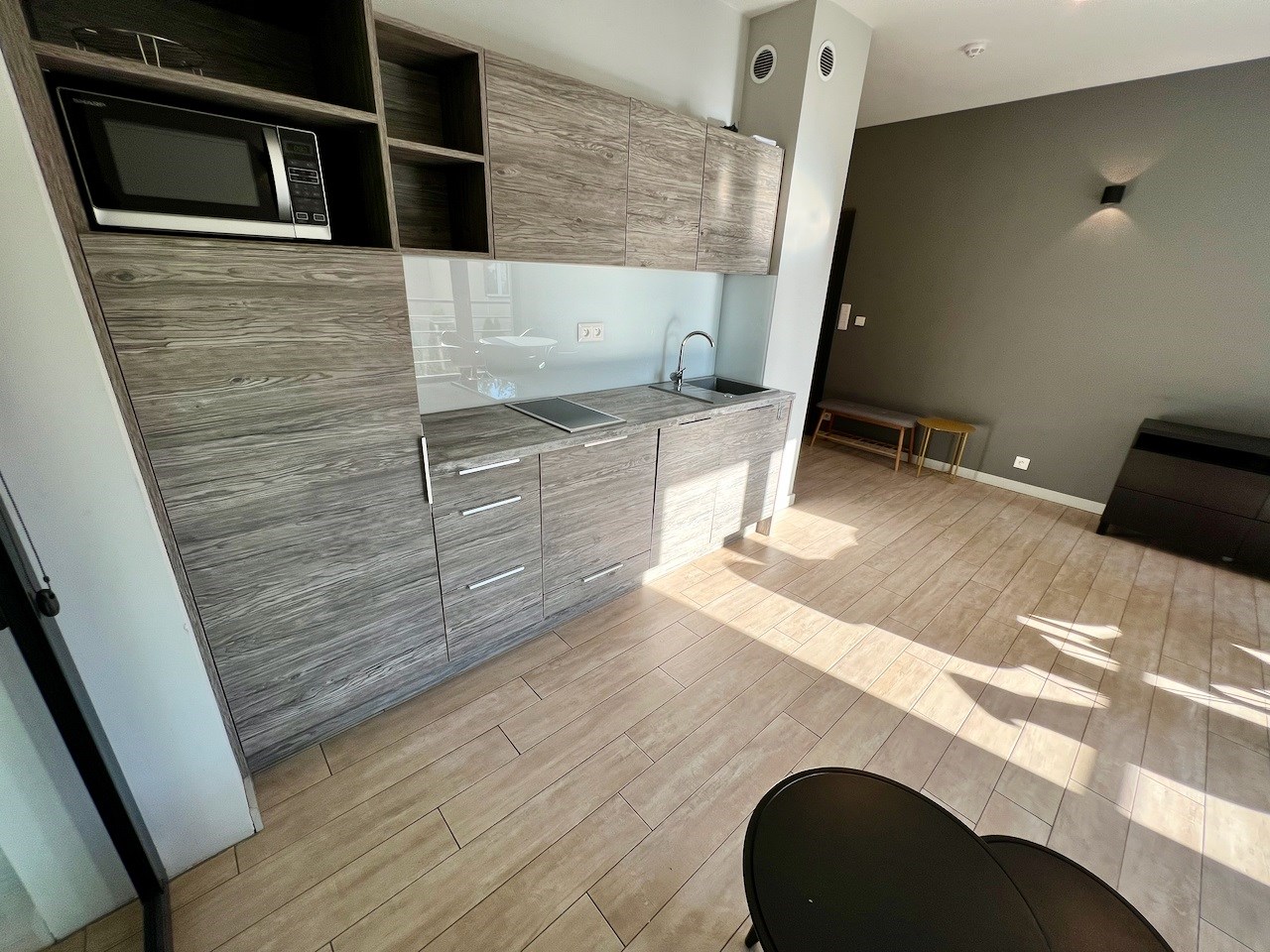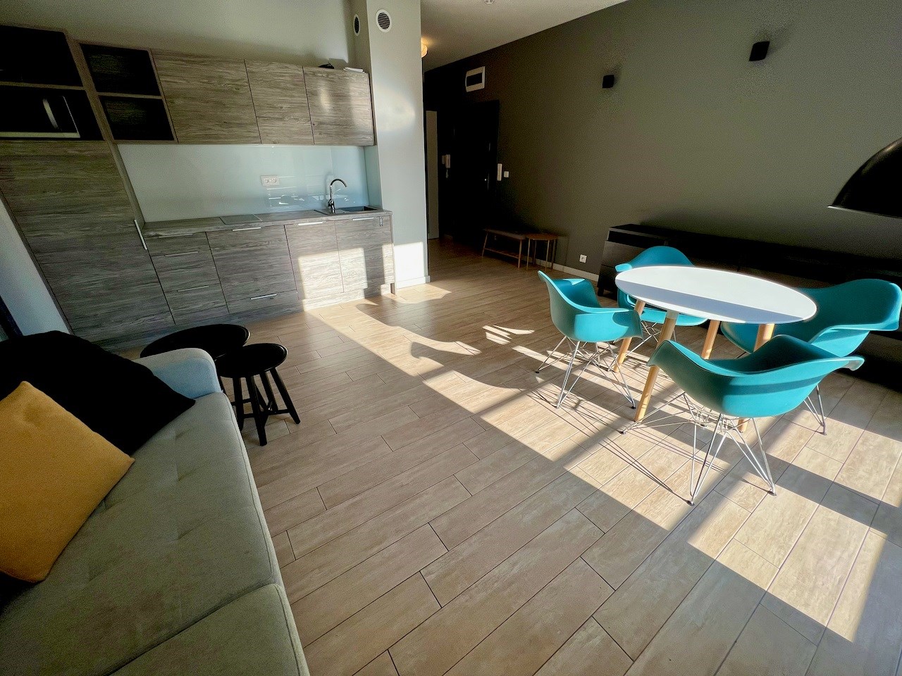 Mieszkanie jest umeblowane i wyposażone. Jest tutaj salon z aneksem kuchennym i sypialnia. W kuchni meble pod wymiar, zabudowany sprzęt AGD (piekarnik, lodówka, zmywarka), wyciąg i płyta elektryczna. Łazienka z kabiną prysznicową.
