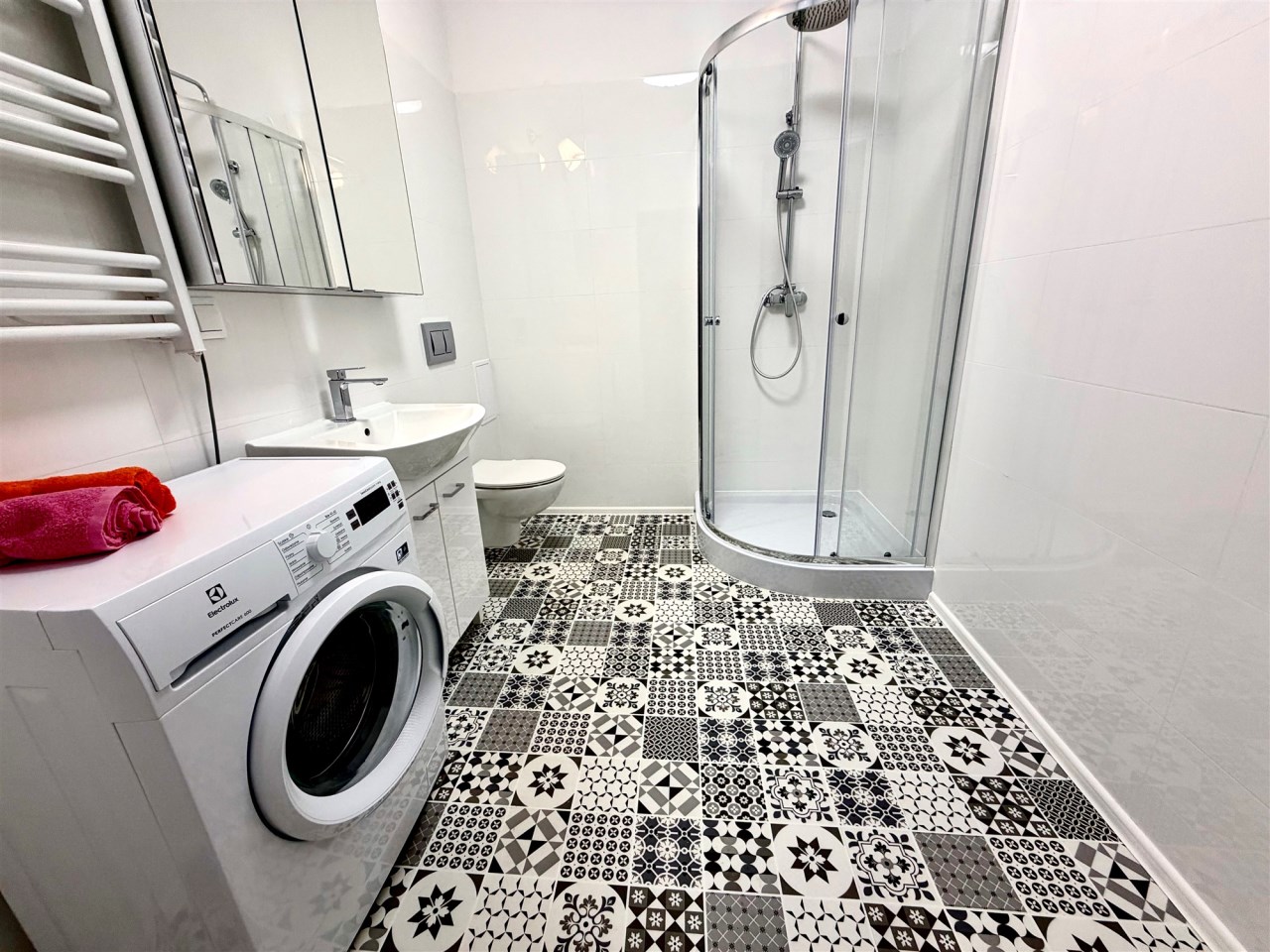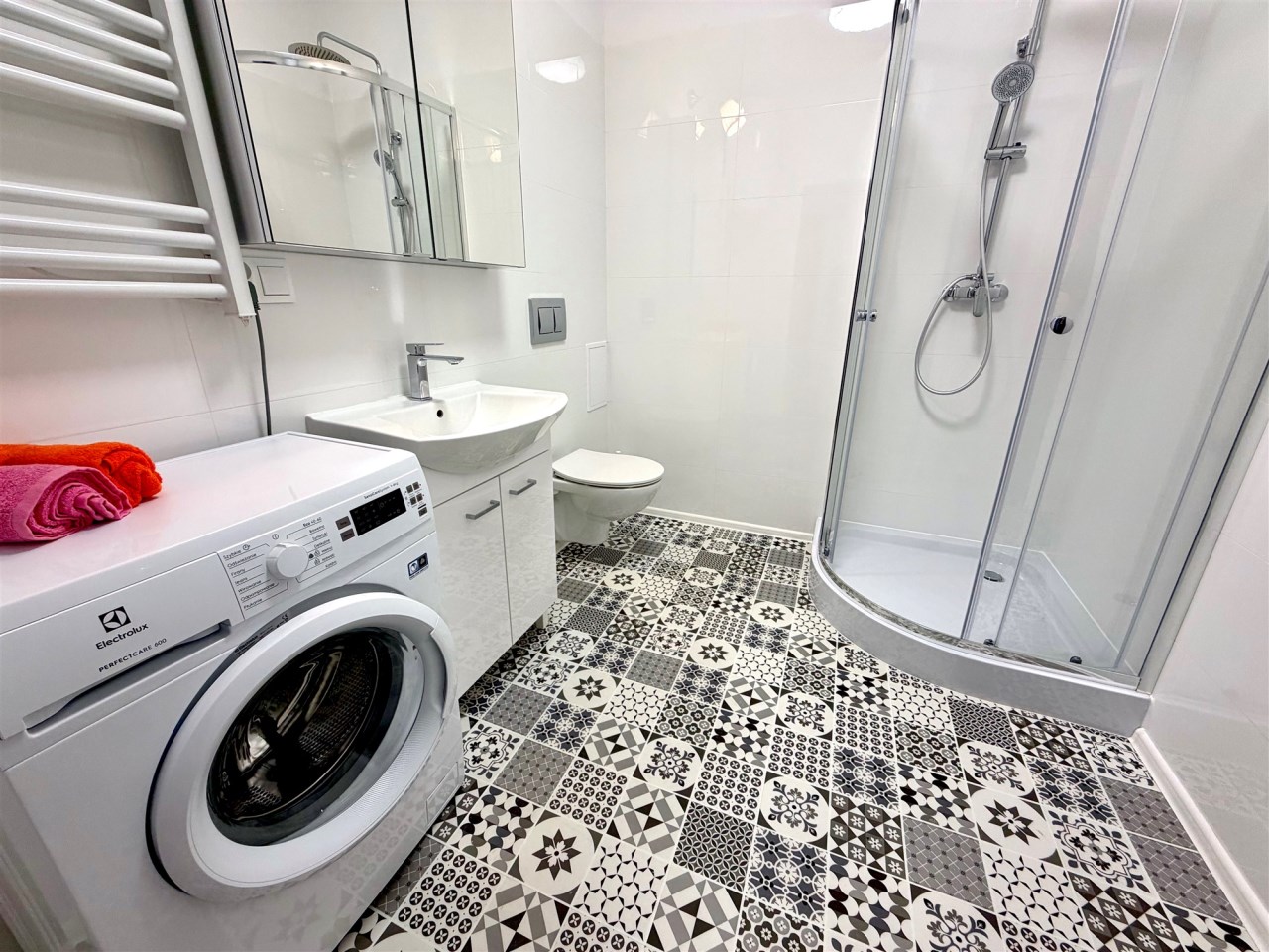 Wyposażenie łazienki | kabina prysznicowa, lustro, pralka, umywalka, WC |